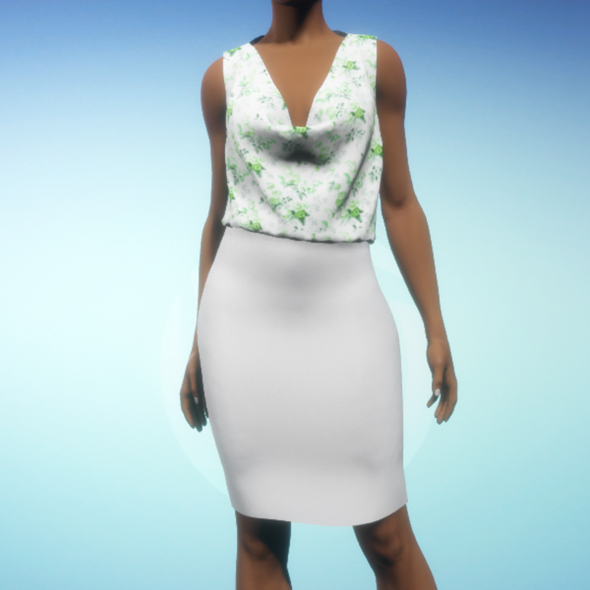 Elegant faux skirt and blouse ensemble. The blouse features a low front cowl neckline and pretty floral print while the skirt is made from classic herringbone fabric. The skirt and blouse cannot be worn separately. By Sweet Distractions