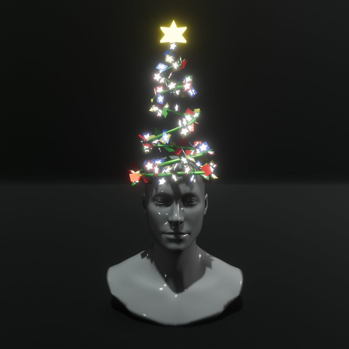 A spiral Christmas tree hat for the male avatar, with a bright star on top and little stars lighting effect, in multi colors.