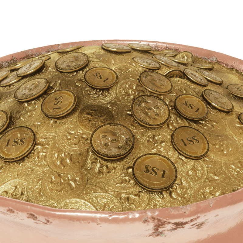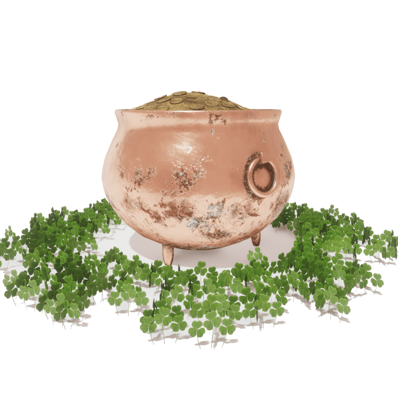 St. Patrick's cauldron filled wirh Sansar gold and surrounded by clover, physics yes
