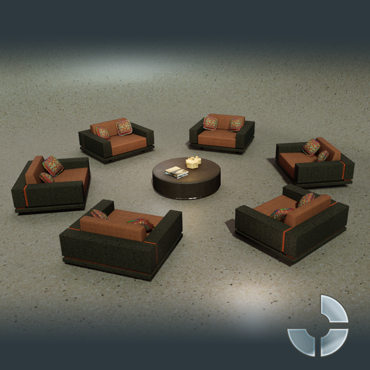 Set of 6 modern outdoors armchairs with a decorated coffee table. Content of the Bundle: - 6 Rustic straw armchairs . 1.5 K Polygons each one- PBR Textures - 1 Coffeetable. 306 Poligons each one - 12 Cushions. 416 Poligons each one - 4 Books. 84 Poligons each one - 3 Jars. 60 poligons each one.