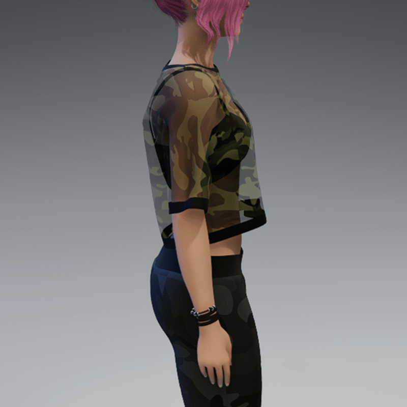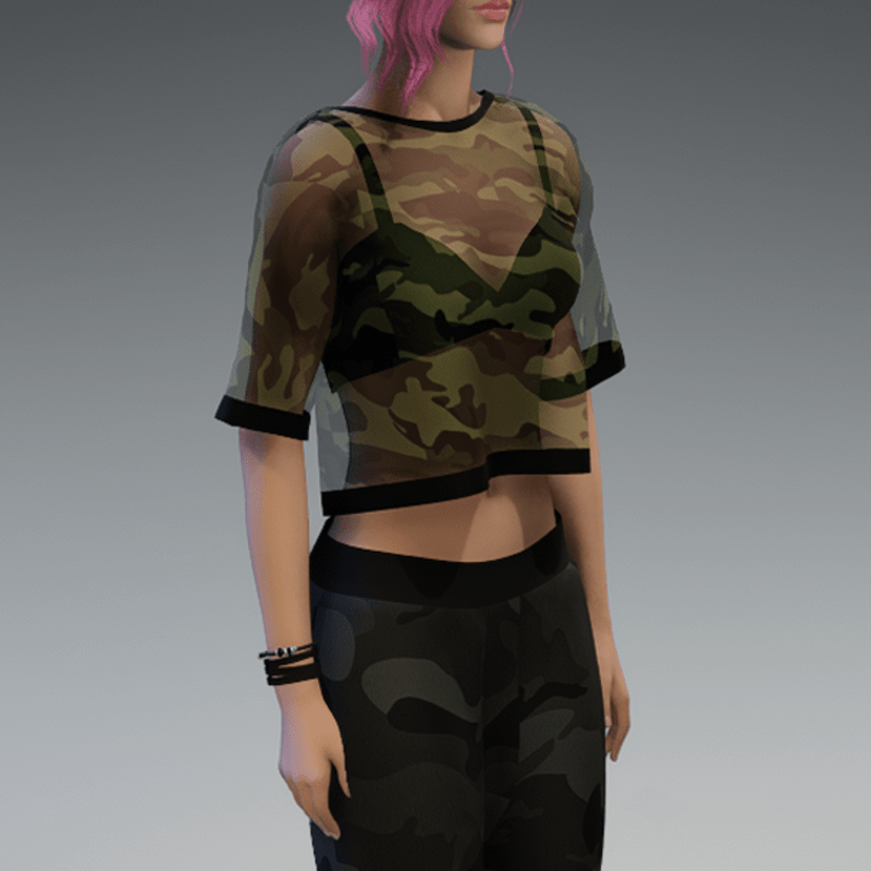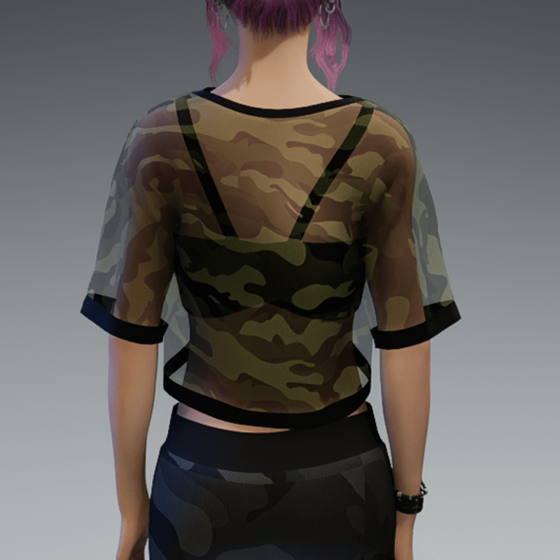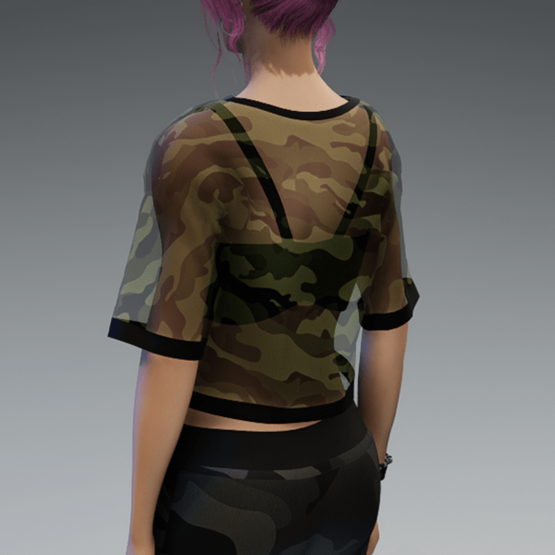 This shirt comes with a dark green and transparent camouflage fabric and a black bikini top under it. If you're not sure about how this one will look like on your avatar, feel free to use my 'siggys store' version first before buying this one. If you're interested in the camouflage sweatpants - you can find it in my store, too! Enjoy!