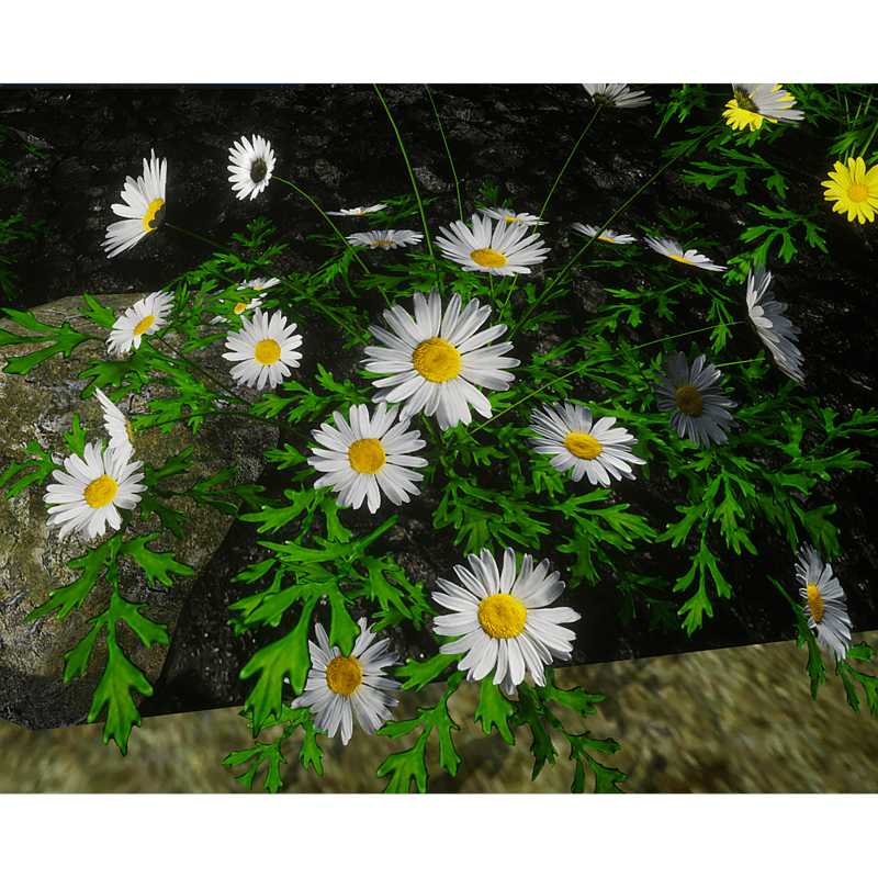 Tall white daisies. Polycount - 2109 triangles. No physical shape. See in Sansar experience - https://atlas.sansar.com/experiences/reidparkin/reid-s-plants