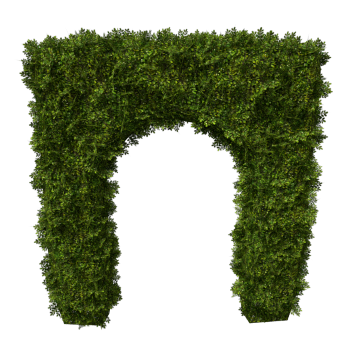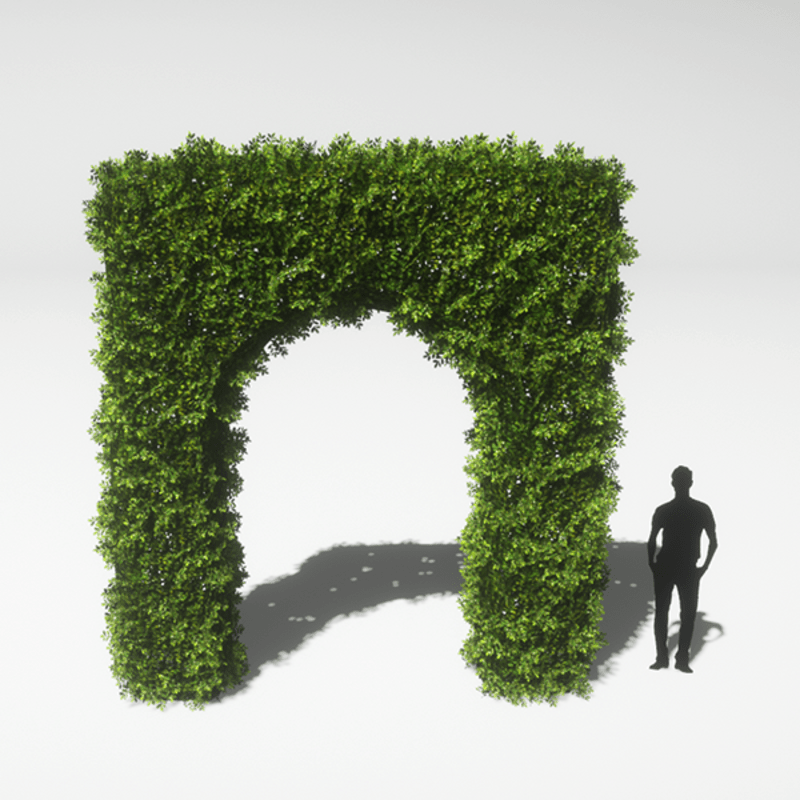 An English Boxwood hedge archway with light green leaves and small white flowers. Opacity mapped textures are used for base and leaves. Approximately 4m wide, 1m deep and 6m tall. 3156 triangles.