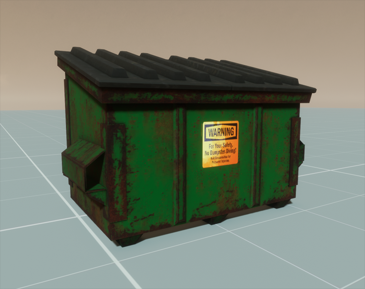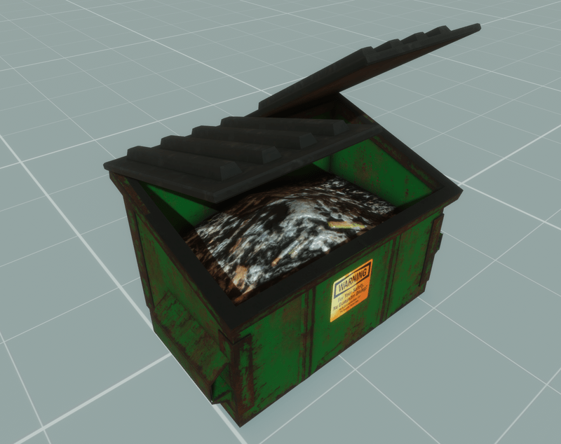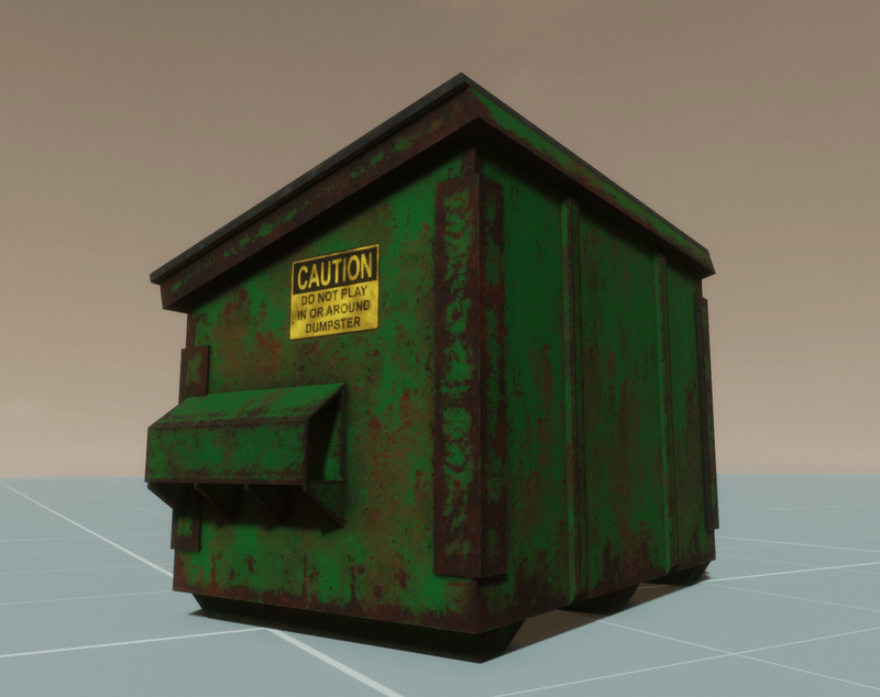 Time to take out the Trash. A dumpster model w collision and full PBR textures. It is set up as a Collection (Group) you can click on the doors separately and rotate them *its not scripted to open automatically ive not figured that out yet.