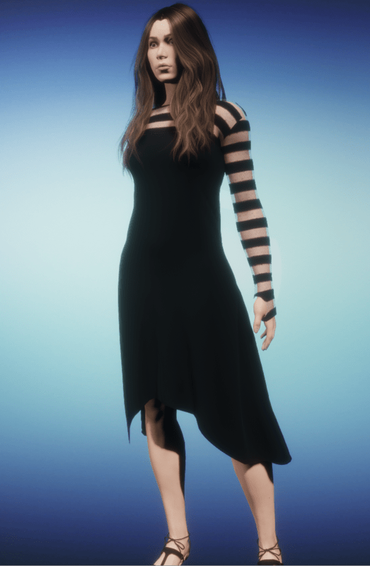 The sleeves have a small hole that fits over the thumb and alternating stripes of transparent dotted lace. Remember to take off your hair before fitting. Turn simulation off; then put your hair back on.