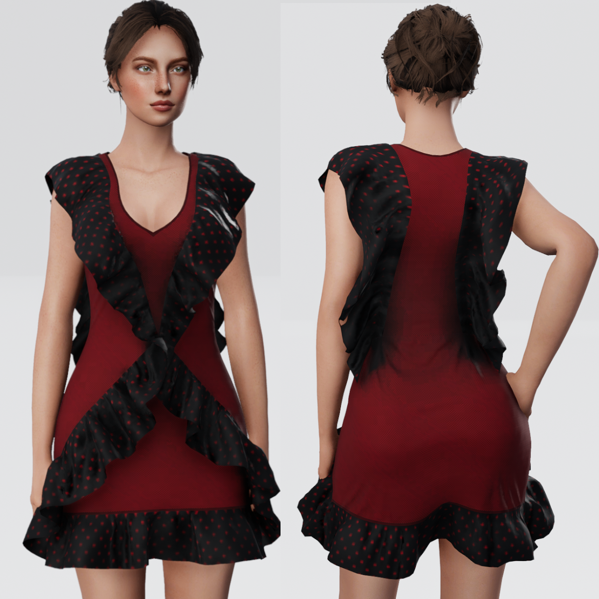Sleeveless Polka Dot Ruffle Dress. Be ready for fun in this sweet little ruffle dress. Get Demo Here: https://store.sansar.com/listings/b53c0d40-0594-48fa-9363-7d3dcafa4011/sleeveless-ruffle-dress---demo Trying on the available Demo is the best way to assure your satisfaction with quality and fit. The lighting isn't the best in the lookbook and the shoulders seem to fit funny in the lookbook as well, so I recommend wearing the demo in world to see how it truly looks on you. Visit my inworld store experience to find discounted items that or not available on the marketplace. https://atlas.sansar.com/experiences/lonaleelancaster/lona Made in Marvelous Designer and can be adjusted to fit most avatars. Please try a demo to assure fit and satisfaction. To learn more about transforming and adjusting Marvelous Designer clothing visit this link: https://help.sansar.com/hc/en-us/articles/115005693363-Fitting-Marvelous-Designer-clothing-to-your-avatar#some-tips