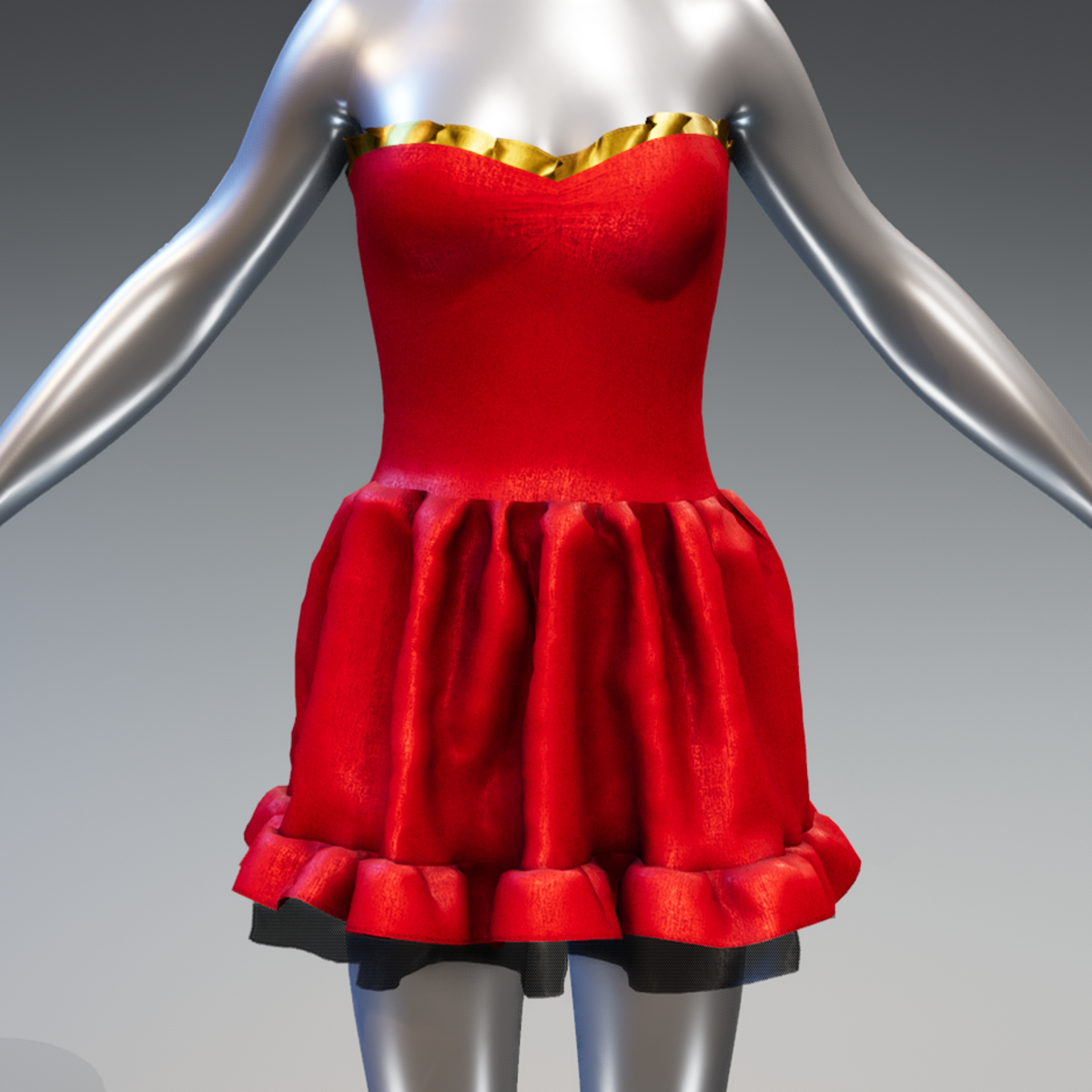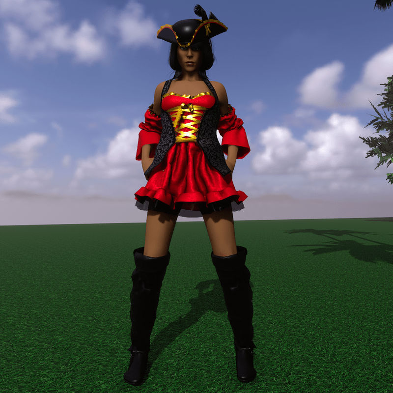 A strapless, short dress in black, red and gold. The dress is part of the pirate costume you can see in the photos.
