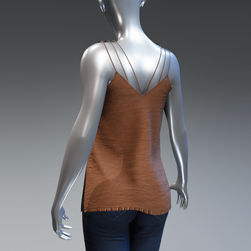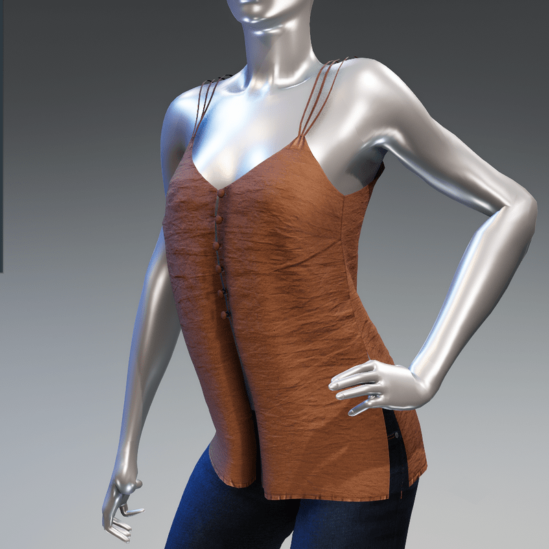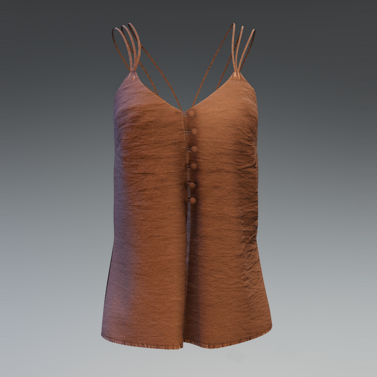 A summer cami top with three spaghetti straps and buttons in front. Is made with wrinkled fabric in solid brown colour. Get the free demo to check the style and fit here: https://store.sansar.com/listings/68dccc25-b0c1-4e21-bdfe-fd7f4e9e7de6/spaghetti-straps-top---demo