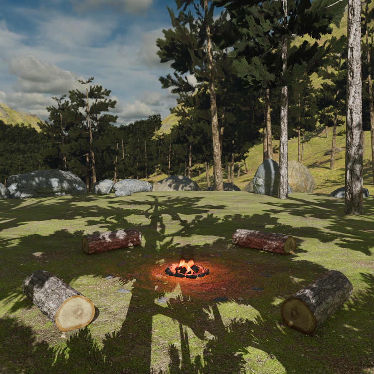 Pine forest and campfire complete starter scene. High Performance setup suitable for events and meetups. Interactive pine trees that spawn branches and pinecones. Interactive campfire with two levels of intensity. Stone circle with kneel pose, you can set it to your own emotes. Skybox and ambient sounds not included, you can find them in my store. 158MB, 25.5k tris. Editable. Pine Forest Skybox Day: https://store.sansar.com/listings/6a637539-8454-4bb8-bb57-818eebd028f3/pine-forest-ground-skybox Pine Forest Skybox Night: https://store.sansar.com/listings/db5b6da5-92e4-42b6-b853-a951193b1088/pine-forest-ground-night Wind on Pine Trees sound loop: https://store.sansar.com/listings/0cbcd3d2-3c60-44a5-a8c1-1d6c3c683b08/wind-on-pine-trees Random Birds Spring: https://store.sansar.com/listings/85745126-1bb8-47a3-a7fc-bc07fedfe020/random-birds-spring Night crickets sound loop: https://store.sansar.com/listings/97d05901-9b1f-4179-9763-1845a93cfb7b/night-crickets-insects-loop