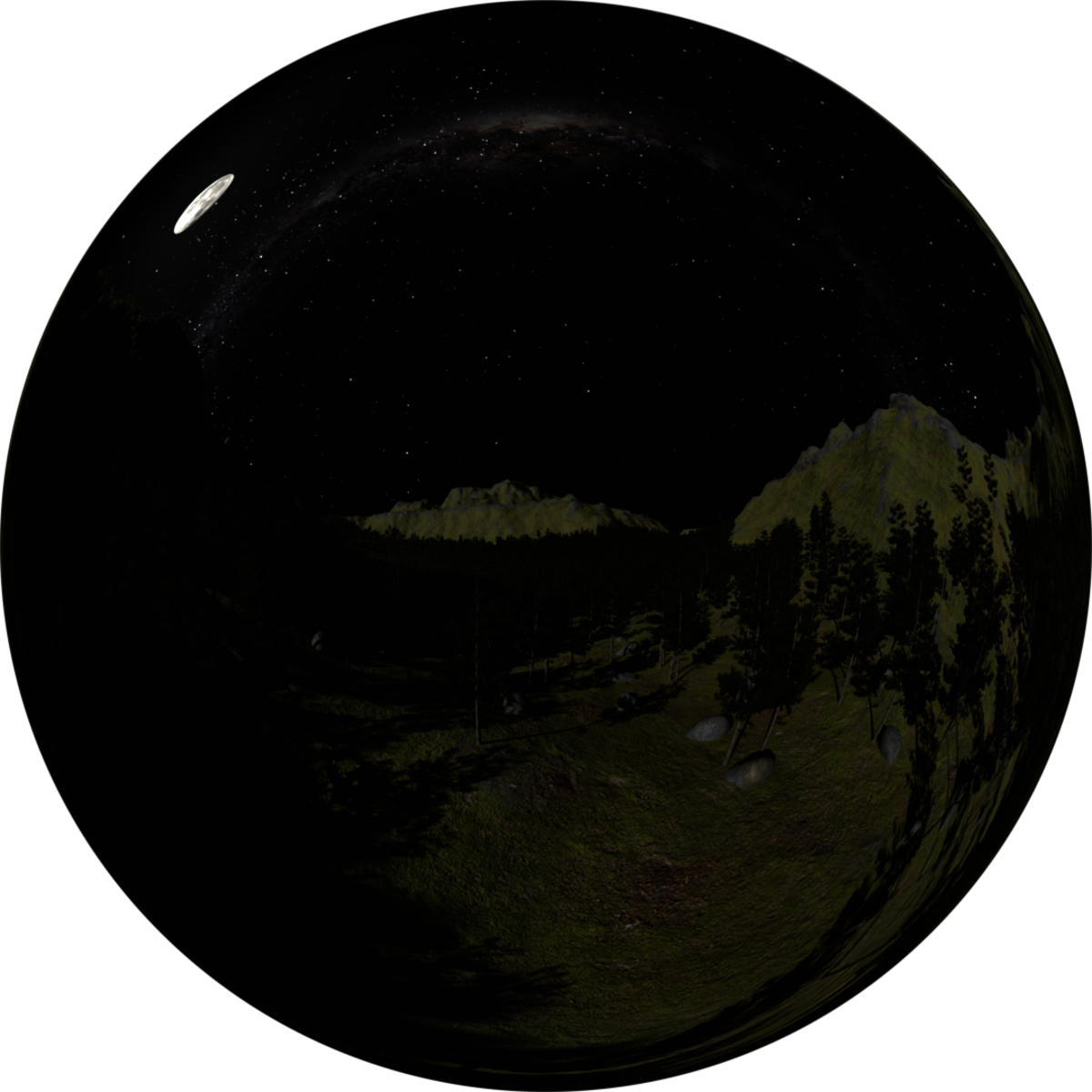 Canyons and pine trees. Night with moon and stars. POV on top of a tree, watch tower, a rock or a small hill. The moon in the image is using the CGI kit of materials published by NASA's Scientific Visualization Studio. The sky is The Milky Way Panorama by ESO/S. Brunier.