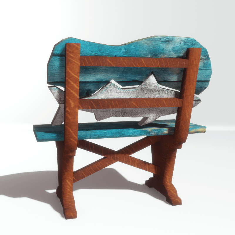 A wooden bench in tropical style for the beach, the deck, the pool or the garden. With a wooden fish on the back in blue and yellow colours. With collision. Take a look here: https://atlas.sansar.com/experiences/luise/studio-lamda