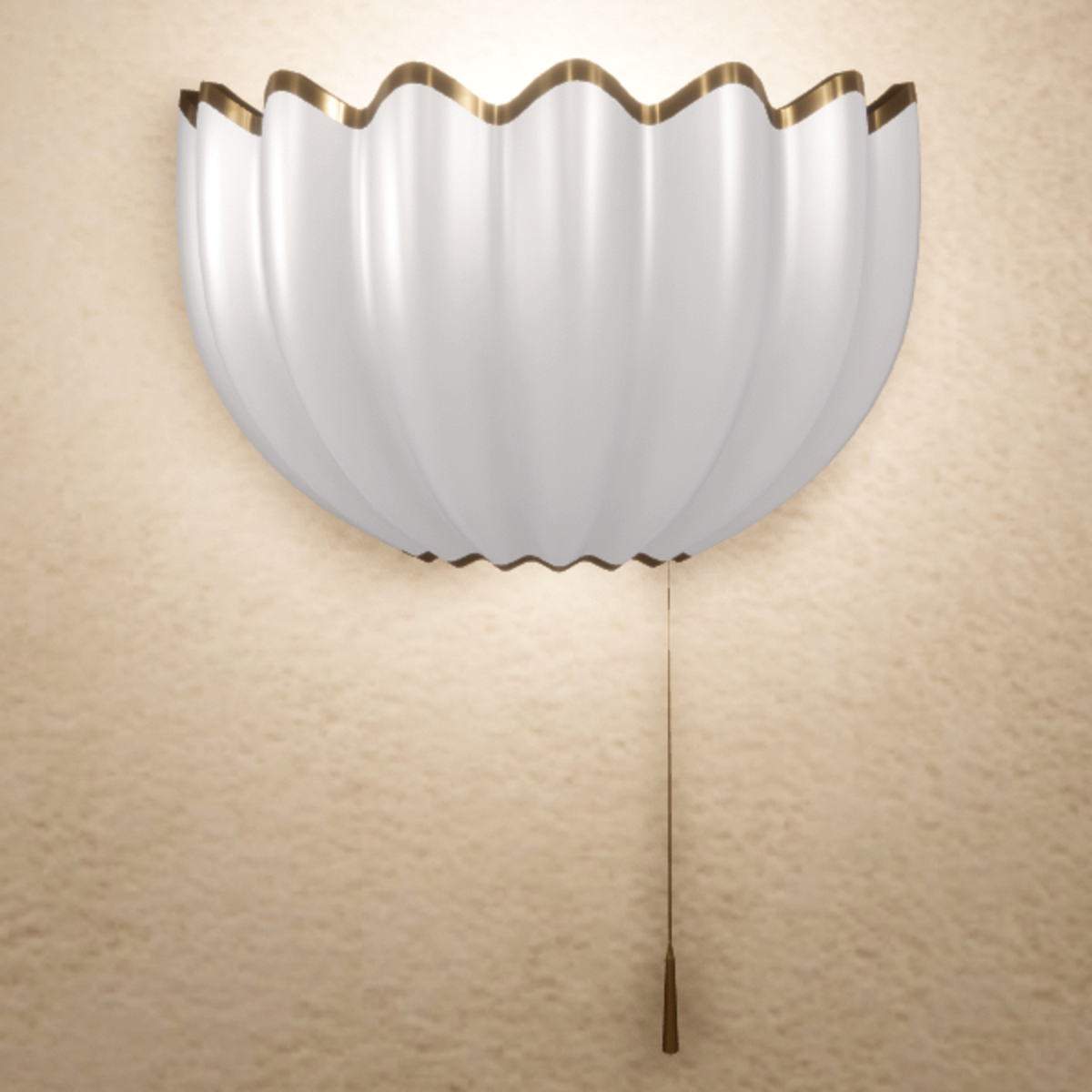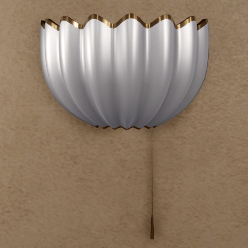 This is a wall lamp with gold borders and rope. It's look like a shell or a flower. There's no collision shape on it. I've set the "Draw Distance Limit" to 32 meters. And you can resale it ! You can see them in Sansar here : https://atlas.sansar.com/experiences/morganeparis/made-in-paris For better render, put several light sources in your room. PS: This is the "not scripted" version, so you will receive 2 lamps : One with light on, and one with light off.
