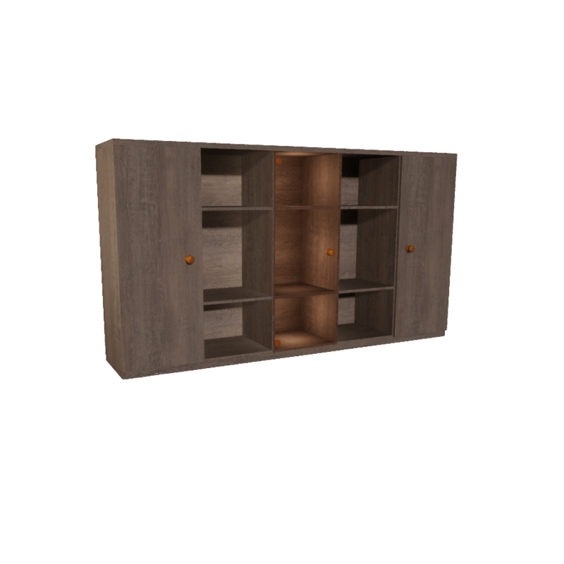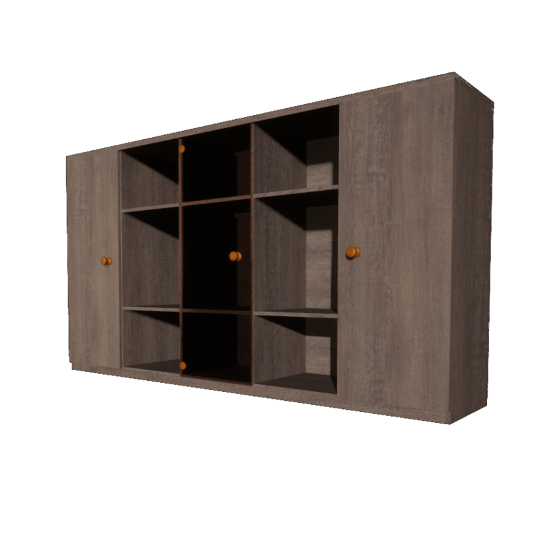 Cupboard in the dimensions 2.0 x 0.44 x 1.10 meters with two wooden doors and one glass door with bronze tint. Outer metal parts are also bronze colored. The doors can NOT be opened! The inner light effect can currently (08-03-17) only be achieved in placing three point lights in the middle of each shelf. The last picture shows how it looks like without any light inside the cupboard. Please note that currently the directional light of the scene does not lighten the inner behind the glass door. But you can use a point or spot light from outside the cupboard to do so. It has also a collision mesh that is insofar detailed that it makes it possible to place other parts on the shelves or of course on top.