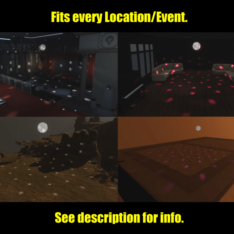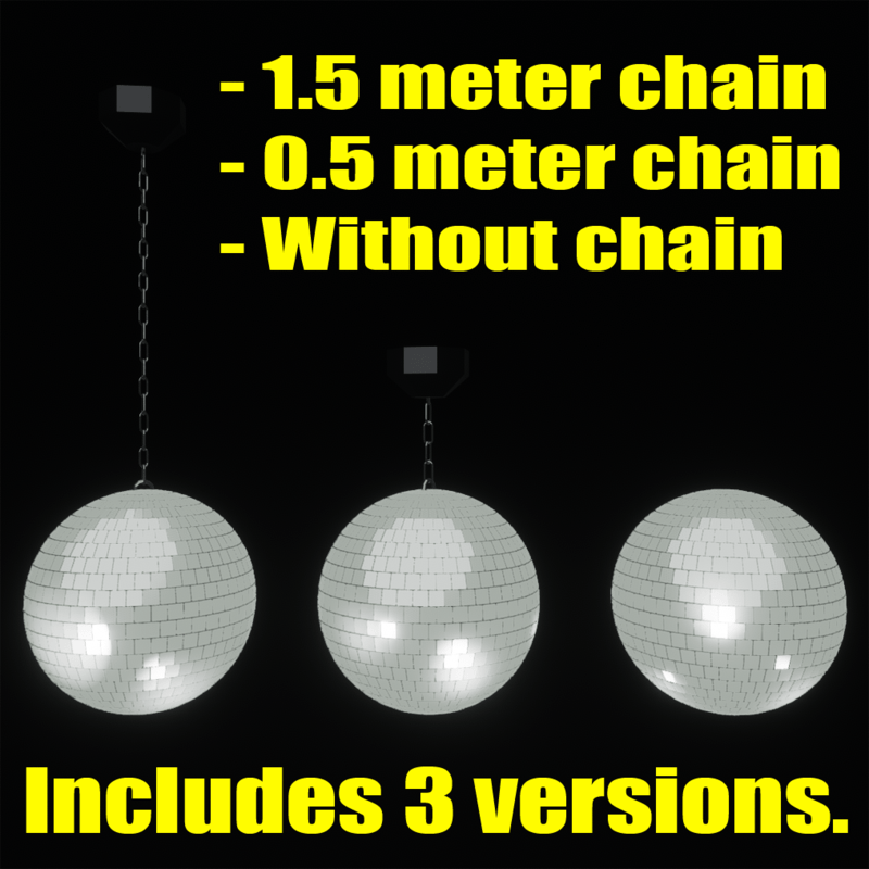 Includes 3 versions: - Chain-length 0.5 meter. - Chain-length 1.5 meter. - Without chain. Video: https://youtu.be/o5WgEfUmqQ0 IMPORTANT: All it's lights have the intensity of Spot1.. If you want to change the intensity you only need to change the intensity of Spot1 (Not to be confused with light1..) Easy configuration options. It's already set-up ready to use but you can change all the settings, in Edit-scene mode. - Choose colors, you can set up to 8 different colors. (A_Colors properties) - Set the time to switch to the next color (in seconds). (B_Timer properties) - Set how many colors you like to use. (B_Timer properties) - Set permission who can use chat-commands (it's now set to "scene owner only", this can be set to everyone. (C_ChatCommands properties) In world chat commands: Speed: /ball speed1, /ball speed2 (up to ten speeds) Backwards: /ball speed1b,/ball speed2b (up to ten speeds) - /ball timer on, /ball timer off (when off the ball keeps shining but it won't switch to next color) - /ball color1, /ball color2 (to show only that color) - /ball off, /ball on - To see all the chat-commands type: /ball help, while visiting your scene. All Property Changes are Editable. Reziseable (as a whole object) You can also add or delete lights and spots. All settings are set Editable. (Tip: Select all the lights in the inspector (by holding Shift) if you want to change multiple lights-settings all at once with the sliders. For Example: If the lights are shining through a wall, change the range settings. Please don't forget to rate the product if you like it :)