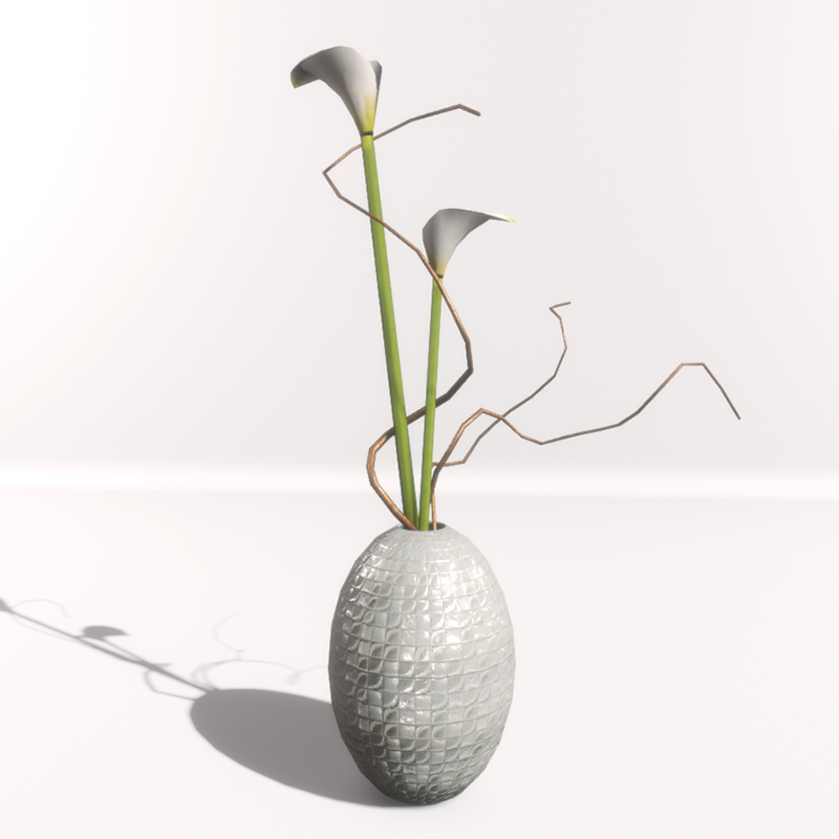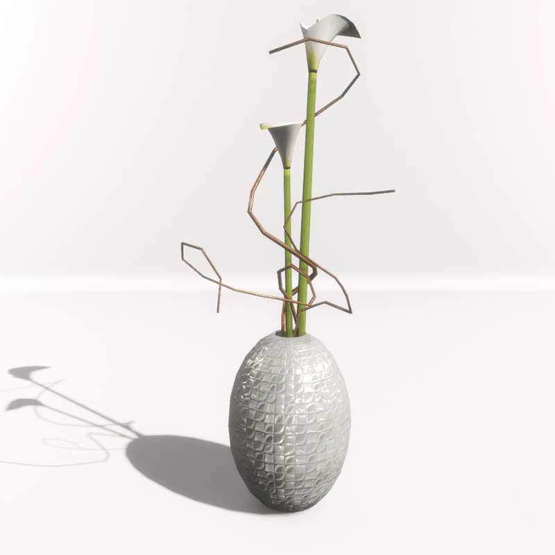 A round oblong white vase with white calla and metallic - cooper branches. It's multi part object (vase, flower, branches) and flowers can removed or rearranged. No collision. Take a closer look here: https://atlas.sansar.com/experiences/luise/studio-lamda