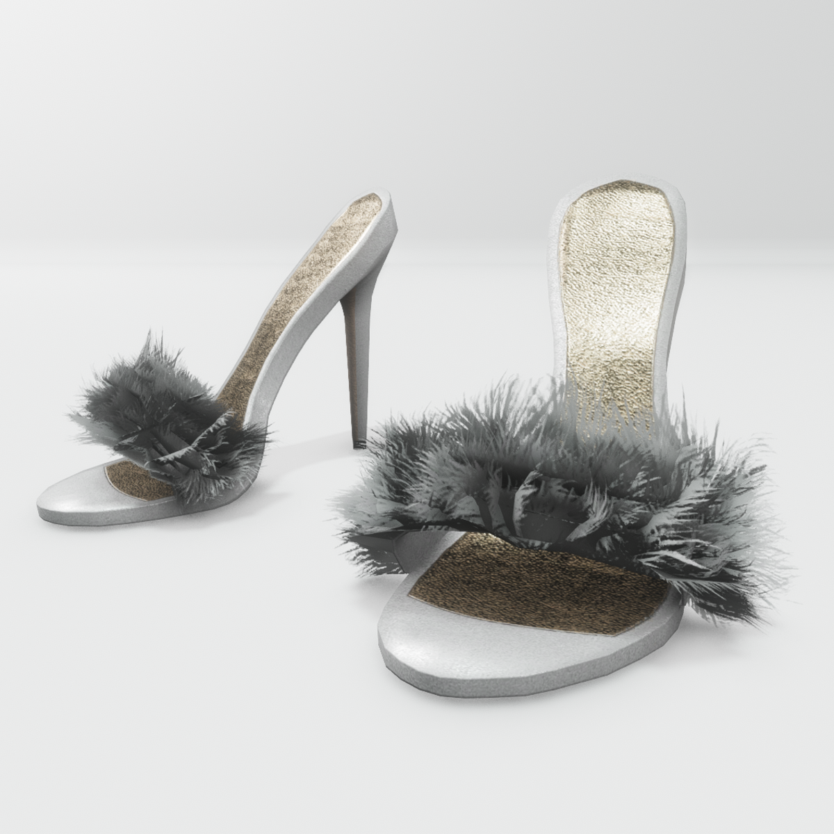 High heeled slippers for avatar Nicci. Stiletto heels, leather material and long decorative fur in white colour. Get the free demo before purchasing here: https://store.sansar.com/listings/e1107515-f91c-4ab0-95d5-0da9c575bbd2/niccis-fur-slippers----demo