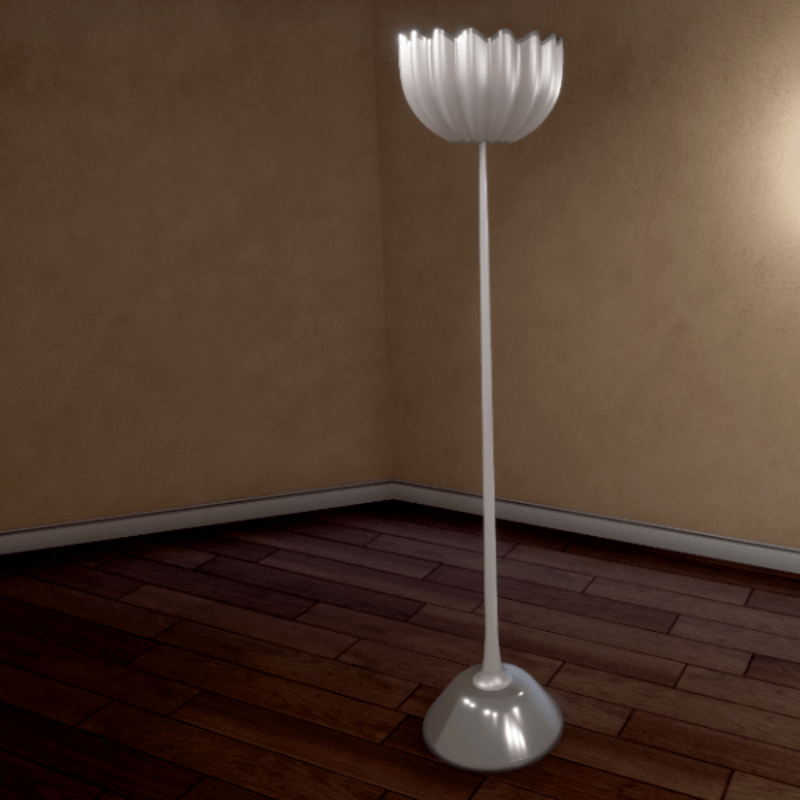 This is a floor lamp with silver borders and base. It's look like a shell or a flower. It is made with a collision shape. I've set the "Draw Distance Limit" to 32 meters. And you can resale it ! You can see them in Sansar here : https://atlas.sansar.com/experiences/morganeparis/made-in-paris For better render, put several light sources in your room. PS: This is the scripted version. In build mode you will only see the base of lamp. Build you scene, with "Global Illum" on for better renders, and then when you visit it the lamp will be full.