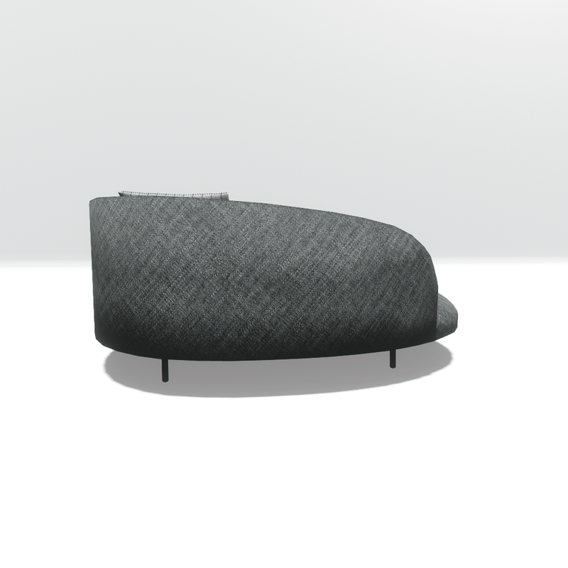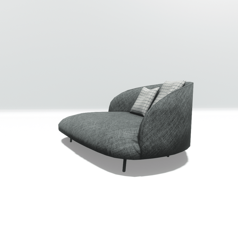 Two-seater sofa with grey fabric and 2 cushions, in a modern, asymmetrical design. It is editable and has collisions.