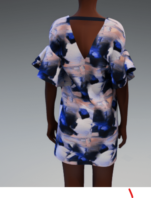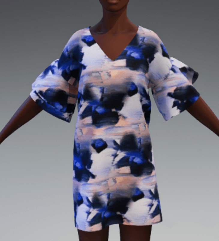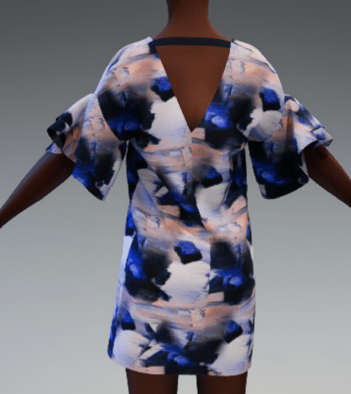Deep v-neck shift dress with v opening in back with strap. Frill sleeves. Short length. Glitch allover print in shades of blues.