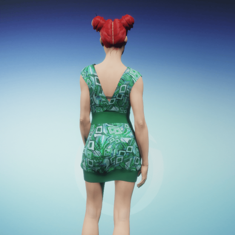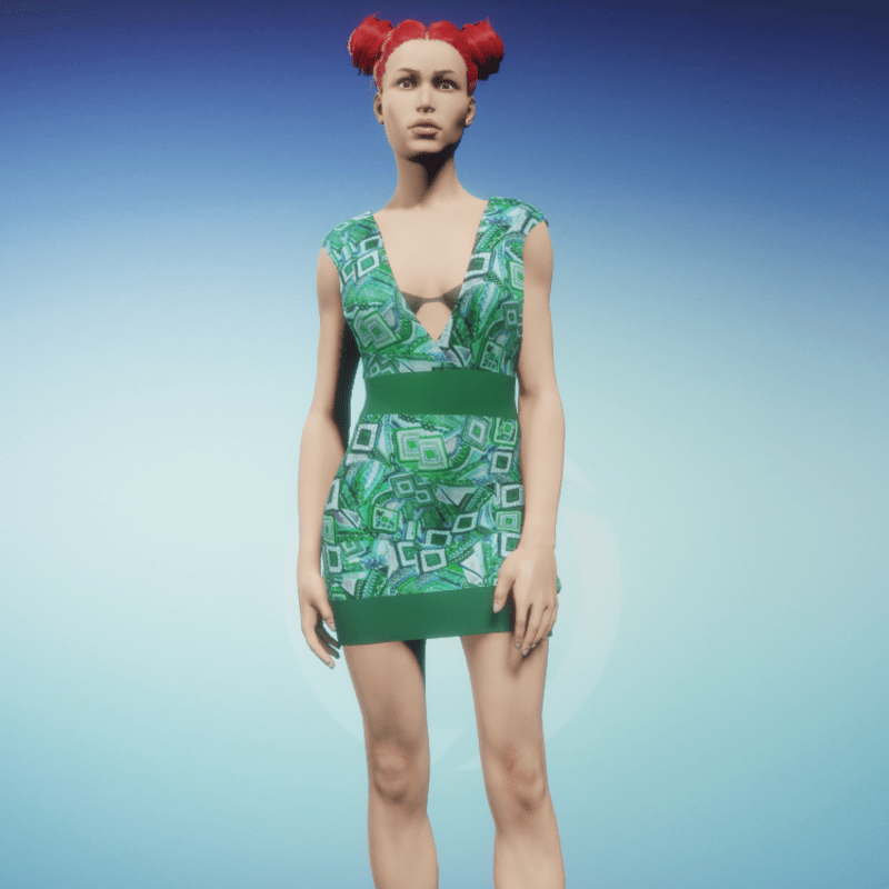 Tube dress with deep neck V with a Green pattern. Made with Marvelous Designer, can be simulated.