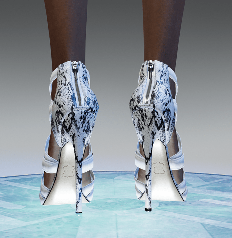 The stiletto heeled sandals feature a stretch textile and leather upper. They closure at the back with a zipper. In white color with snake leather details. Get the free demo item before purchasing to check style and fitness here: https://store.sansar.com/listings/cc5291c7-8654-4bf2-bcfe-0a3d251248b2/strappy-stiletto-sandals-for-h2ai-high---demo