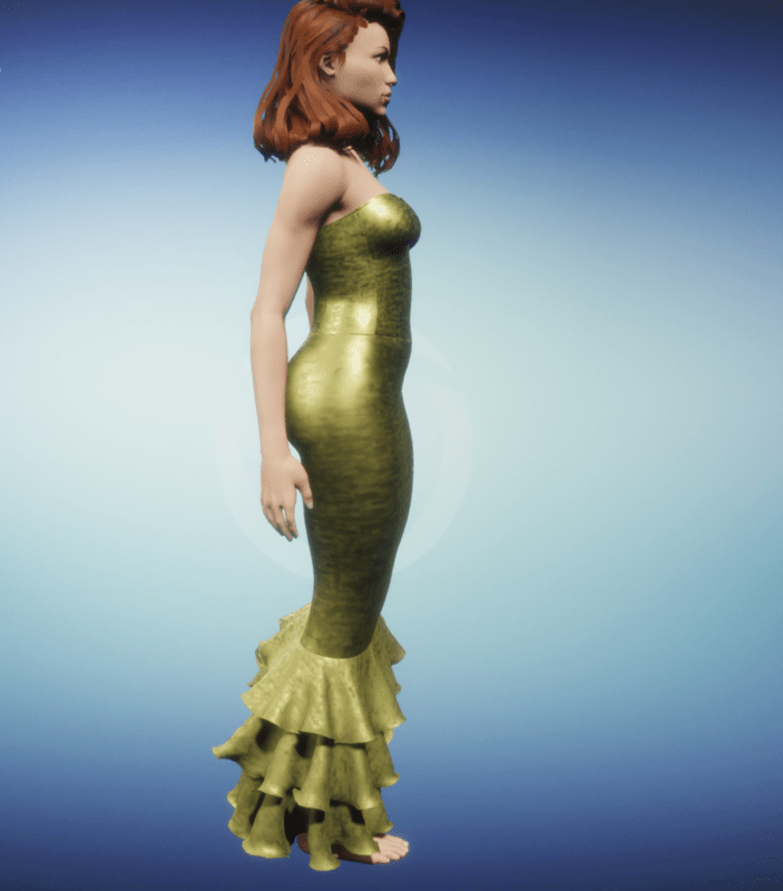 Classic mermaid dress as introduced in the 1940's. Skin-hugging strapless satin sheath dress with frilly layers at the lower edge. In gold.