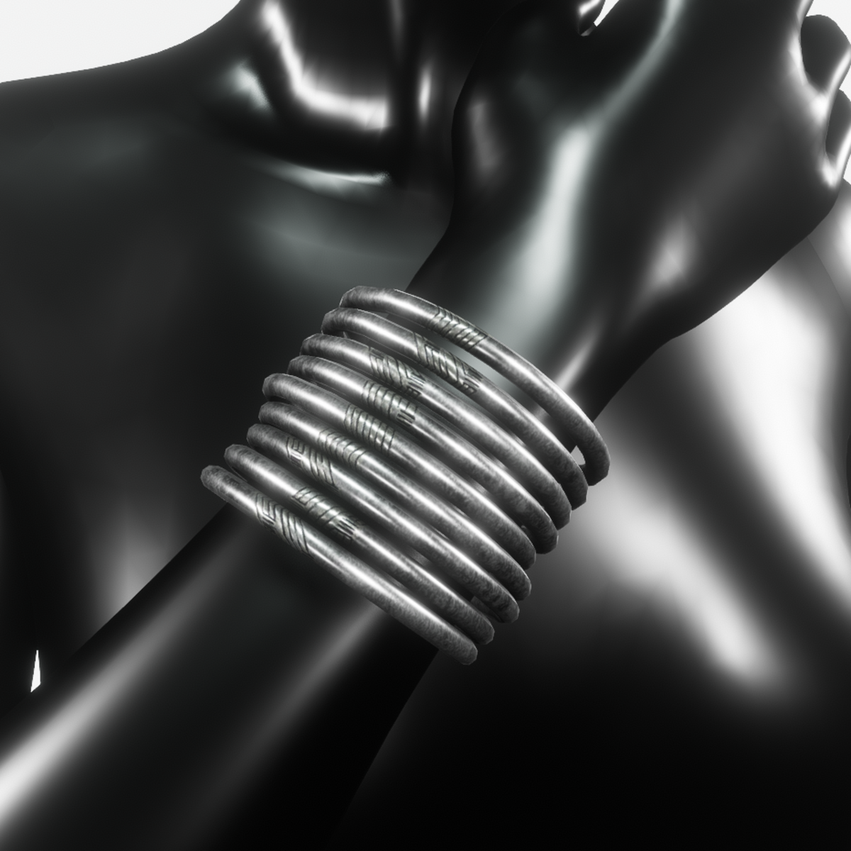 A set of nine bracelets in silver colour with small geometric design on the front side.