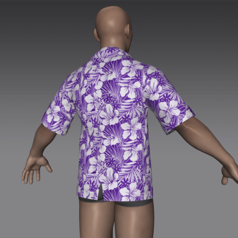 A shortsleeve, lightweight cotton shirt featuring a traditional bright Hawaiian print of white hibiscus flowers against a purple background. Breast pocket, square hem and rolled cuffs.