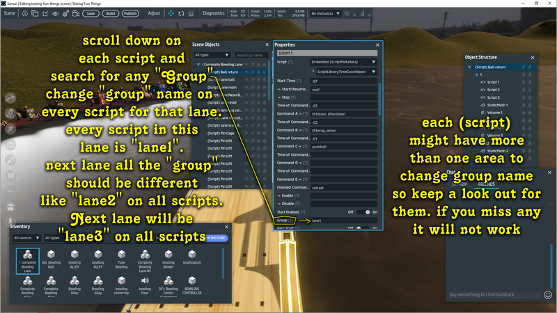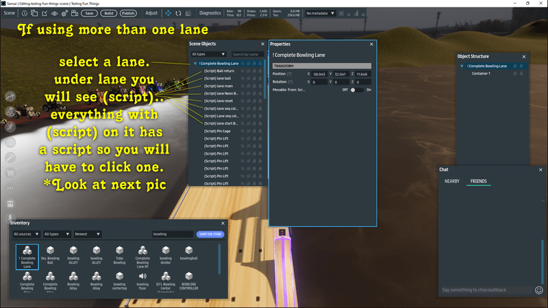 M3N4C3 crafted Fully Functional Bowling Alley, with neon lighting.NO Scoring though. All scripted and ready to rock. To add more than one lane, you must duplicate it, then in "Scene Objects" you will see each piece of the alley and are labled with (Script) for every script you must change the "group name" from "lane1" to "lane2" for the second lane and so on. ((NOTE)) if you have the original, please come see me for the FREE Update.. must be placed completely on ground level. Come and check it out in person at https://atlas.sansar.com/experiences/djm3n4c3-9174/dj-s-bowling-center2