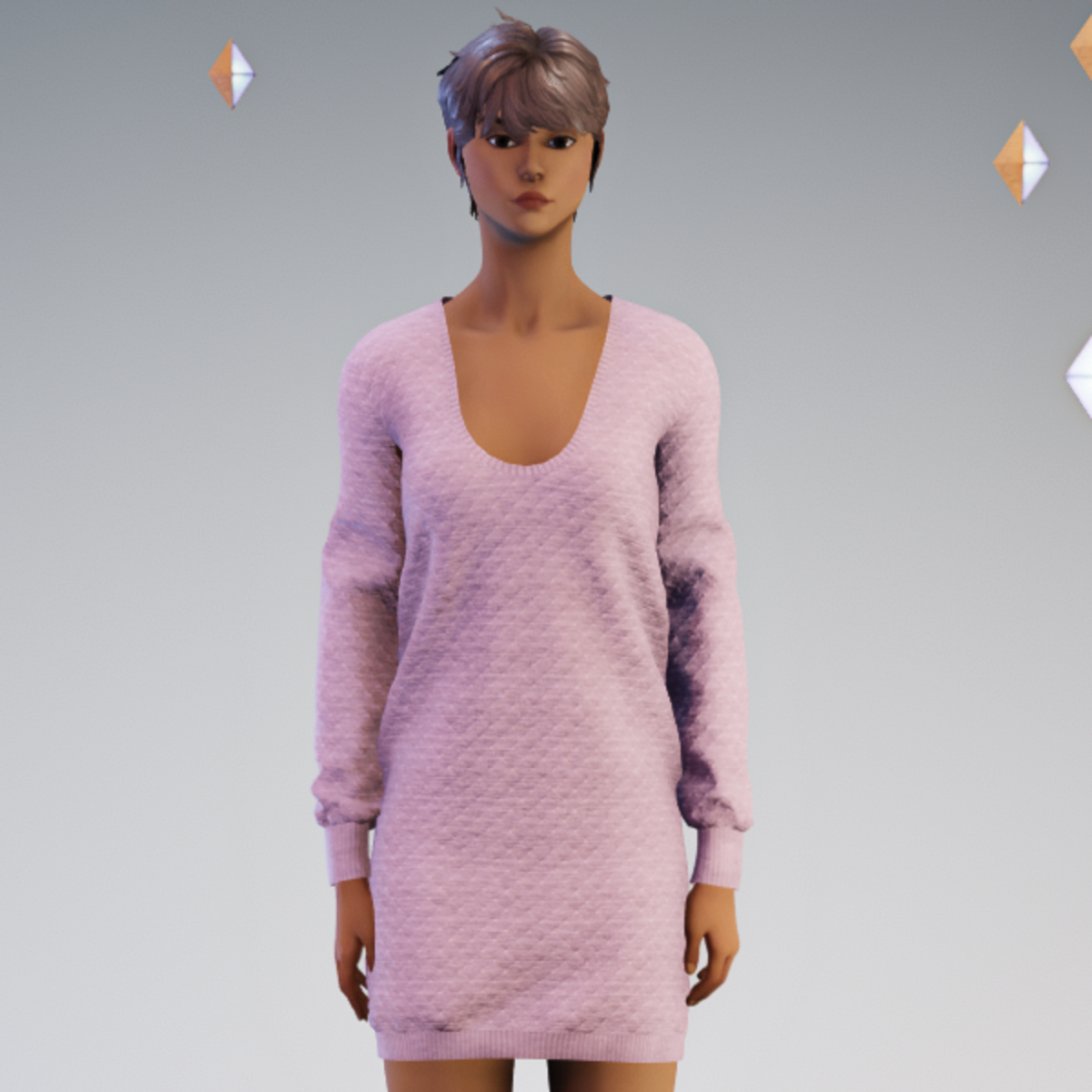 Quilted sweater dress has low scooped neck and full sleeves with ribbing. Materials enhanced. Please try demo.