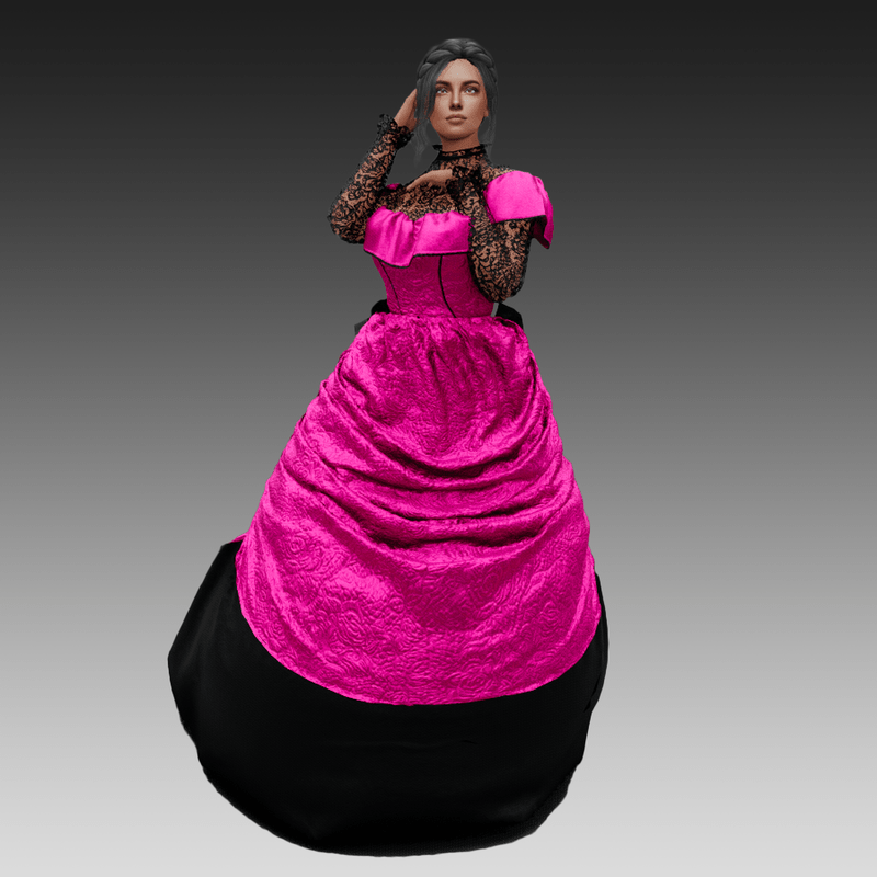 Gown fits all human female avatars. Be aware that the actual simulating takes a little more time than normal but pulling and tugging will (mostly) not be needed. Also be aware that you cannot add more clothing. This design is building in assigned layers to prevent bleeding fabrics.
