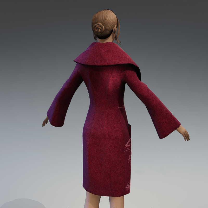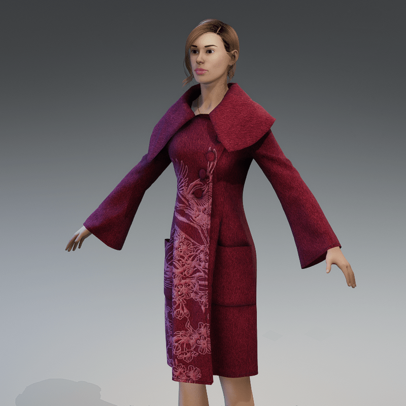 A winter wool coat with embroidery on the front right side and a large asymmetrical collar. It has wide at the ends sleeves and slanting large buttons. In dark red colour.