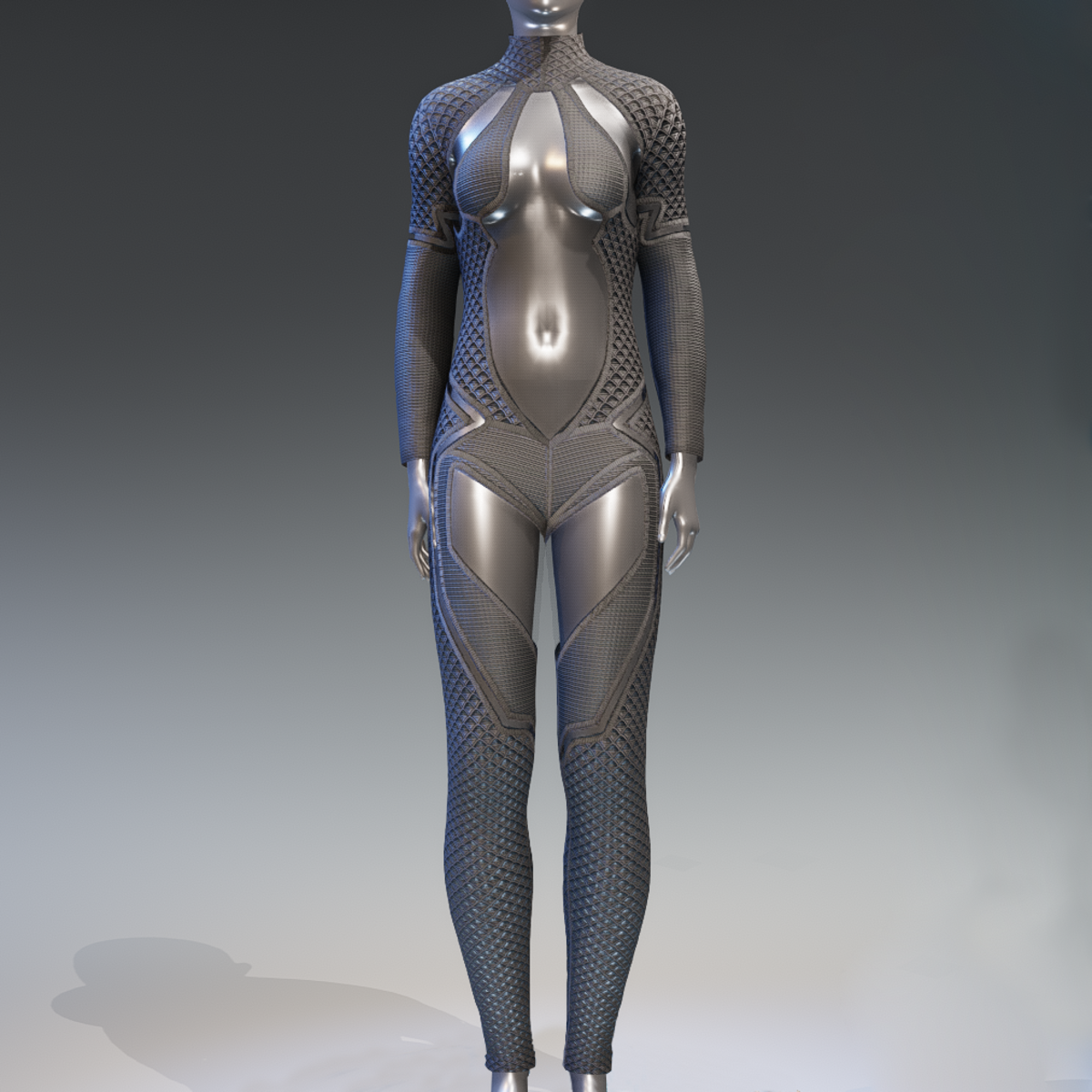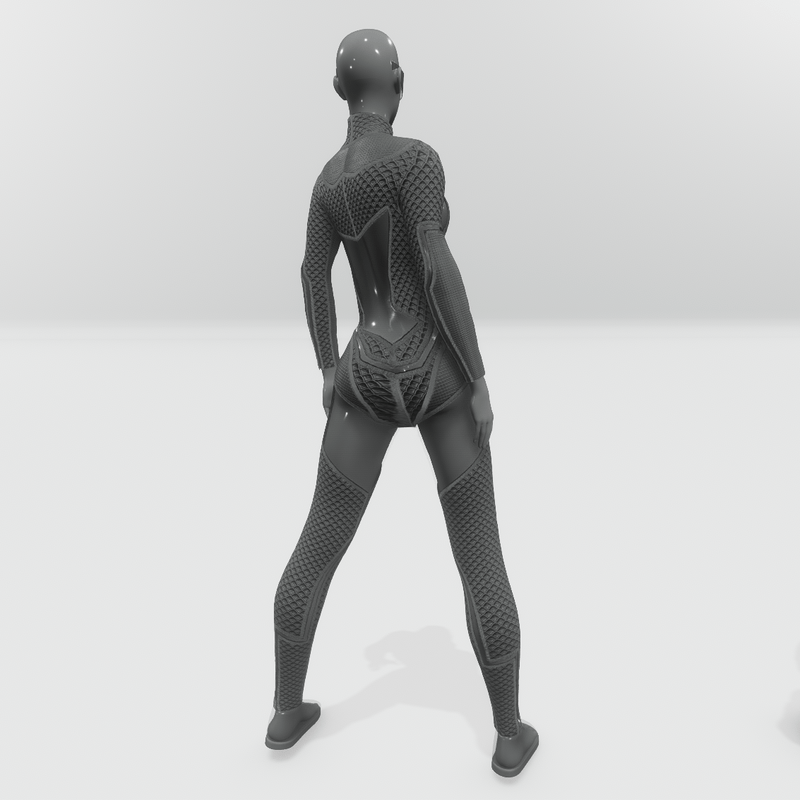 Futuristic female jumpsuit, with large, plastic like, high transparent areas. It has long sleeves and mock turtleneck. Grey color. Get the free demo item to check fit and style before purchasing here: https://store.sansar.com/listings/89a0defa-80b5-4282-a3d5-f5d807904673/baryt-jumpsuit---demo