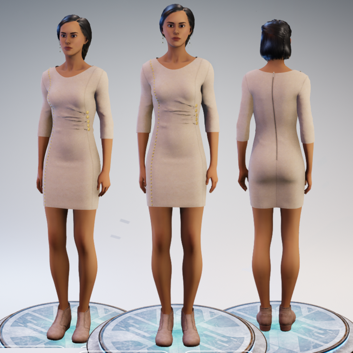 A bodycon suede dress with small and bigger decorative metallic buttons and a zipper at the back.