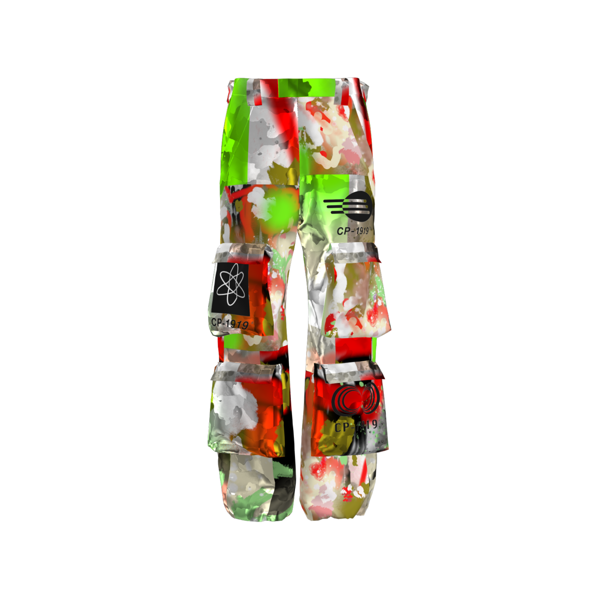 Long Cargo Trousers with 8 pockets. Paint splatter print and multiple logo variations. Loose fit and holographic camouflage pattern. ***Original CP1919 piece***
