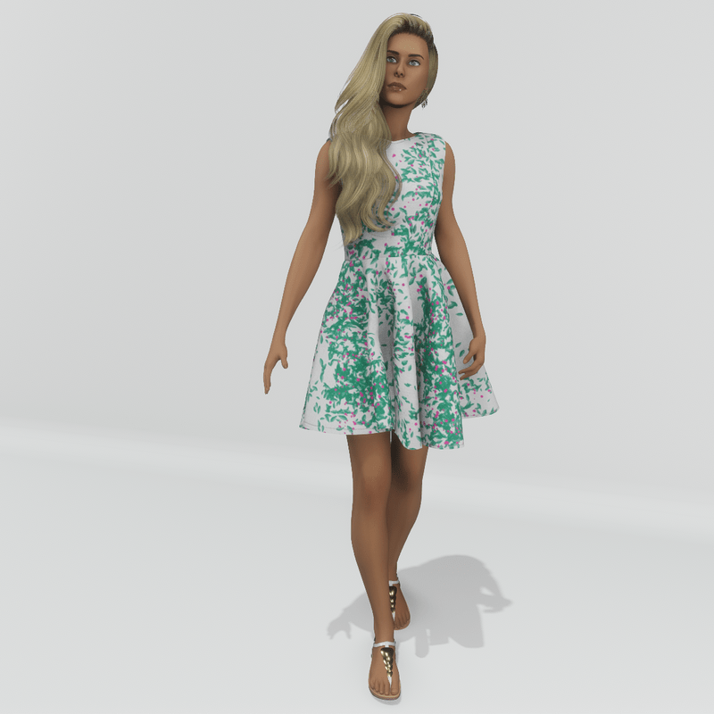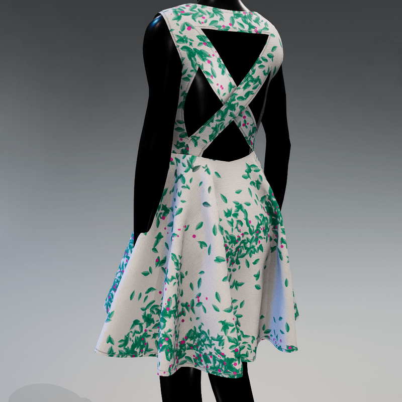 Casual, a-line, sleeveless mini dress for the spring and the summer. The back is open and the fabric is printed with abstract pattern. In white and green colour.