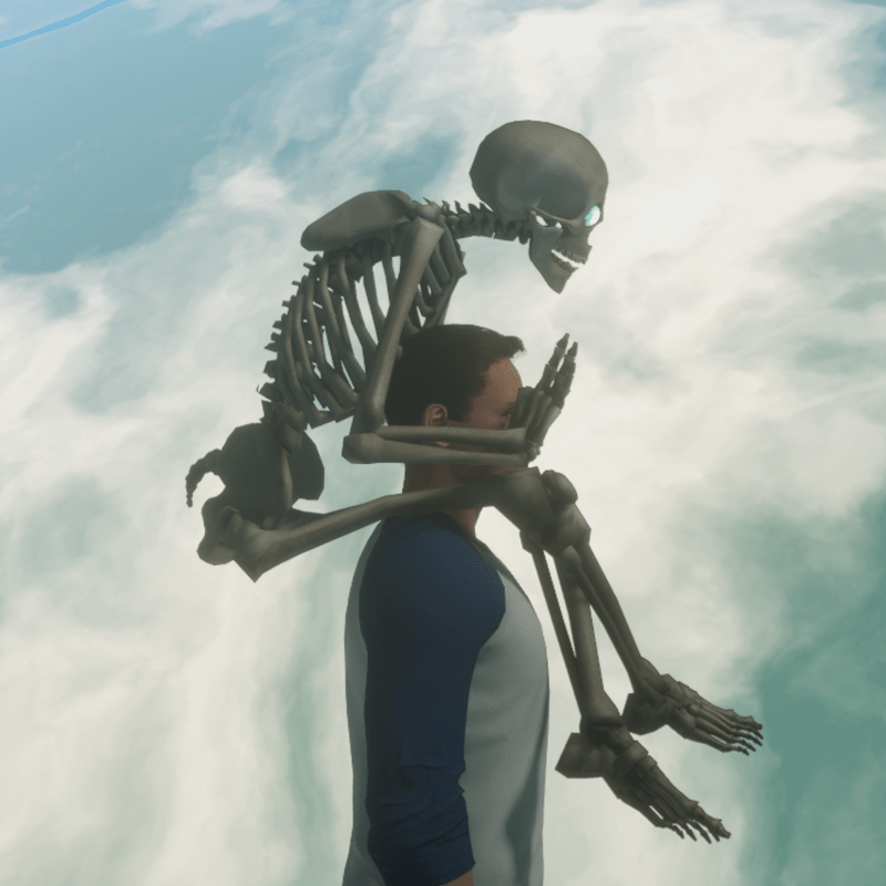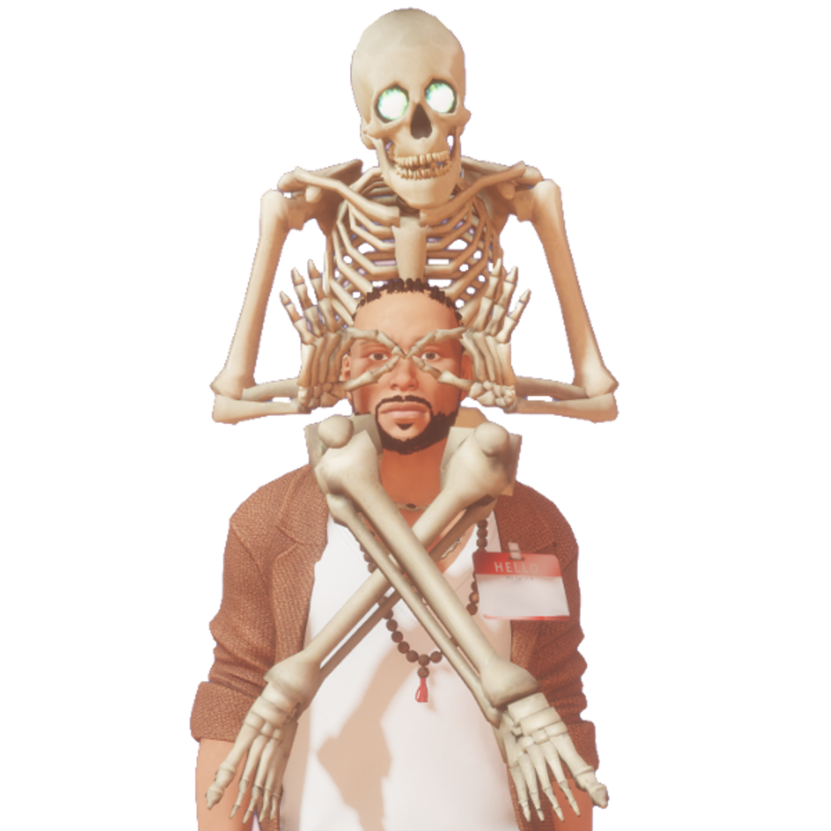 Skeleton with animated eyes sitting on your shoulders, male version, thumbnail yes, worn on glasses