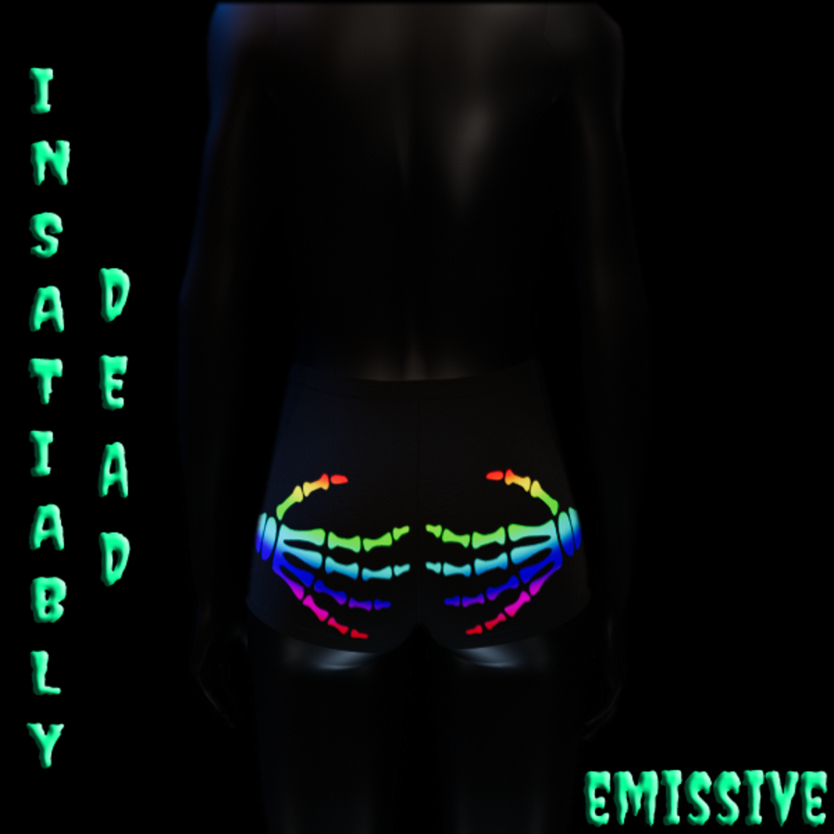 EMISSIVE SKELE HANDS SHORTS RAINBOW. [EMISSIVE MEANS I GLOW! PLEASE NOTE THAT ACTUAL COLOR/VIBRANCE WILL VARY BASED ON LIGHTING. FOR THE BEST RESULT WEAR IN AREAS WITH LOW LIGHTING.] CREATED IN MARVELOUS DESIGNER WITH AVATAR 2.0. ADJUSTMENT MAY BE REQUIRED! FITTING INSTRUCTIONS CAN BE FOUND BY GOING TO THE LINK BELOW. https://help.sansar.com/hc/en-us/articles/115005693363-Fitting-Marvelous-Designer-clothing-to-your-avatar PLEASE RATE AFTER BUYING! IF ANY ISSUES OCCUR PLEASE CONTACT TEAGAN BROKKEN FOR ASSISTANCE. THANK YOU! <3 <3 GET INSATIABLY DEAD <3