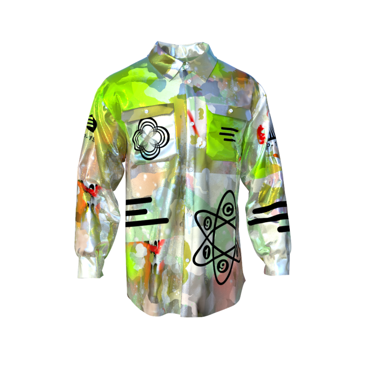 Long Sleeve Button Shirt with paint splatter print and multiple logo variations. Loose fit and holographic camouflage pattern. ***Original CP1919 piece***
