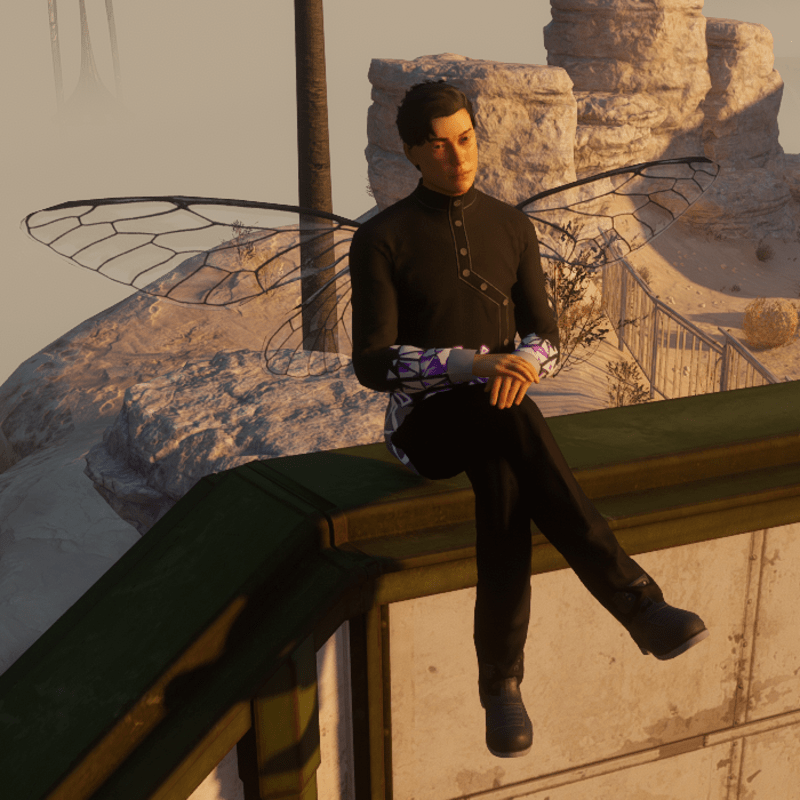 Works with male framed avatars. Works best on ledges but buggy with chairs, should work for all sized avatars. Simple static cross legged pose for sitting on a ledge with legs hanging down. To use, simply stand at the edge of a ledge facing the direction you want your legs to hang and play the emote. How to use example gif: https://gyazo.com/09eb3bc6cfe50e787547ee7d3b0fff1f If you are wearing our fairy wings they bend down into a more relaxed position with this emote. Female version available here: https://store.sansar.com/listings/e4a20f6c-f1be-4ecf-b7c6-adb7599f1676/crossed-legs-ledge-sitting---static-pose-f-emote Contact "TheNick-1981" through Sansar or Sansar discord if you need re-rigging, a custom design or if there is a problem etc.