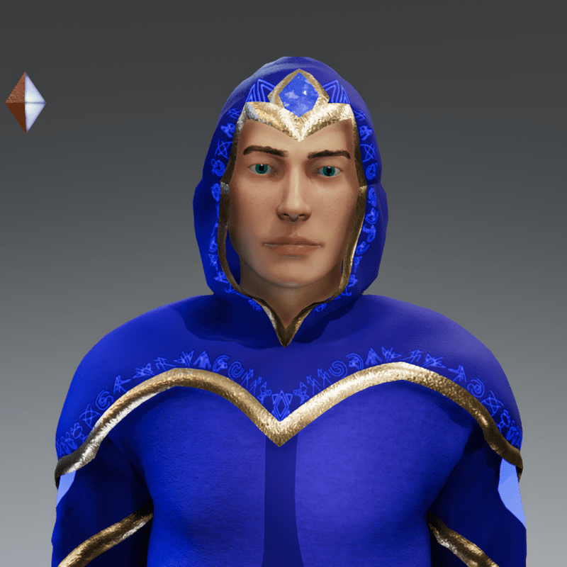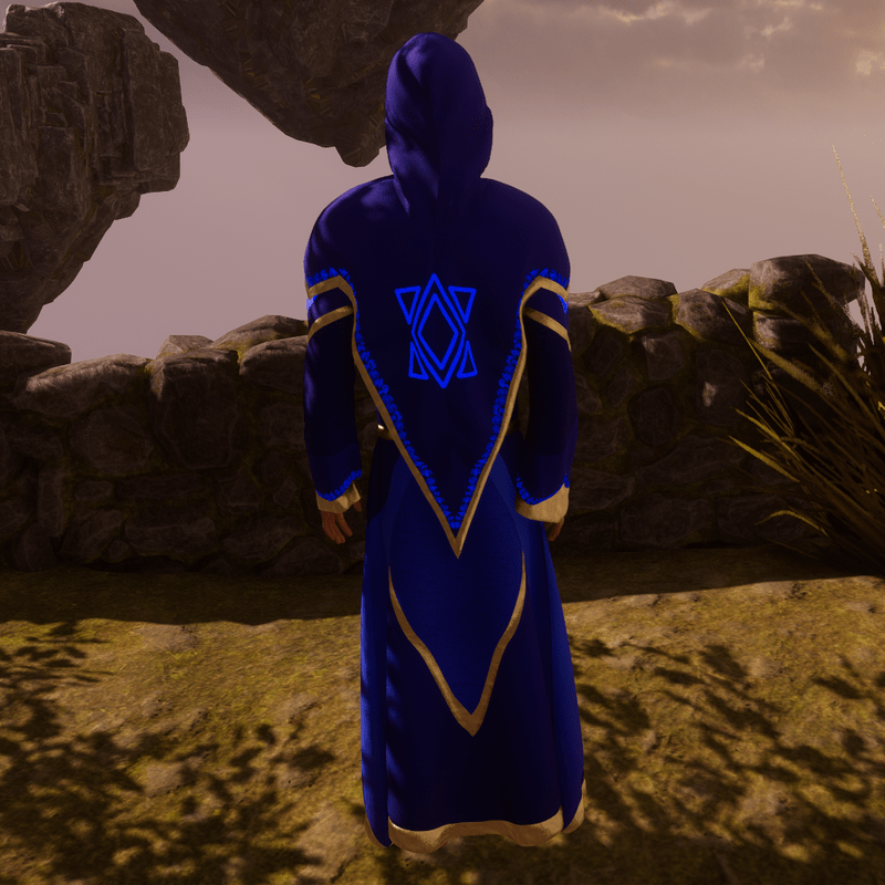 Rich Lapis Lazuli coloured robes with golden trims, two large glowing Lapis Lazuli gems set in the hood and belt. To top it all off, patiently crafted original runic alphabet lining the hood and sleeves that is luminous and animated with a pulse that fades in and out of visibility. The enchanted gemstones also glow in the same manner as the runes. Fitted to the default male avatar 2.0. A very magical garment perfect for any aspiring wizard or mage, can be used for role-play or just as a fancy outfit for a party.