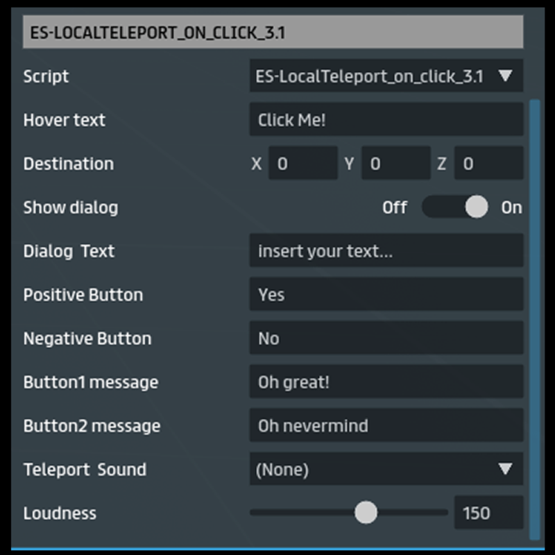 Finally we can click everything! This simple script teleports an user to a destination point (inside the same experience) after he clicked an object. -HOW TO USE: Insert the script in a object you want to click. -PARAMETERS TO SET: [HOVER TEXT] Set the hovertext you want to appear [DESTINATION] Insert coordinates of your destination point inside the scene. [SHOW DIALOG] If on, a dialog with two buttons will appear on click [POSITIVE BUTTON] Set button text [NEGATIVE BUTTON] Set button text [BUTTON 1 MESSAGE] Add an optional message if positive button is clicked [BUTTON 2 MESSAGE] Add an optional message if negative button is clicked [TELEPORT SOUND] Add an optional sound when you reach the destination. [LOUDNESS] Set loudness of audio file. [FIND MY OTHER SCRIPT SEARCHING BY TAG "easyscript"] ★ If you like this item, please support me giving a rate! www.sergiodelacruz.net
