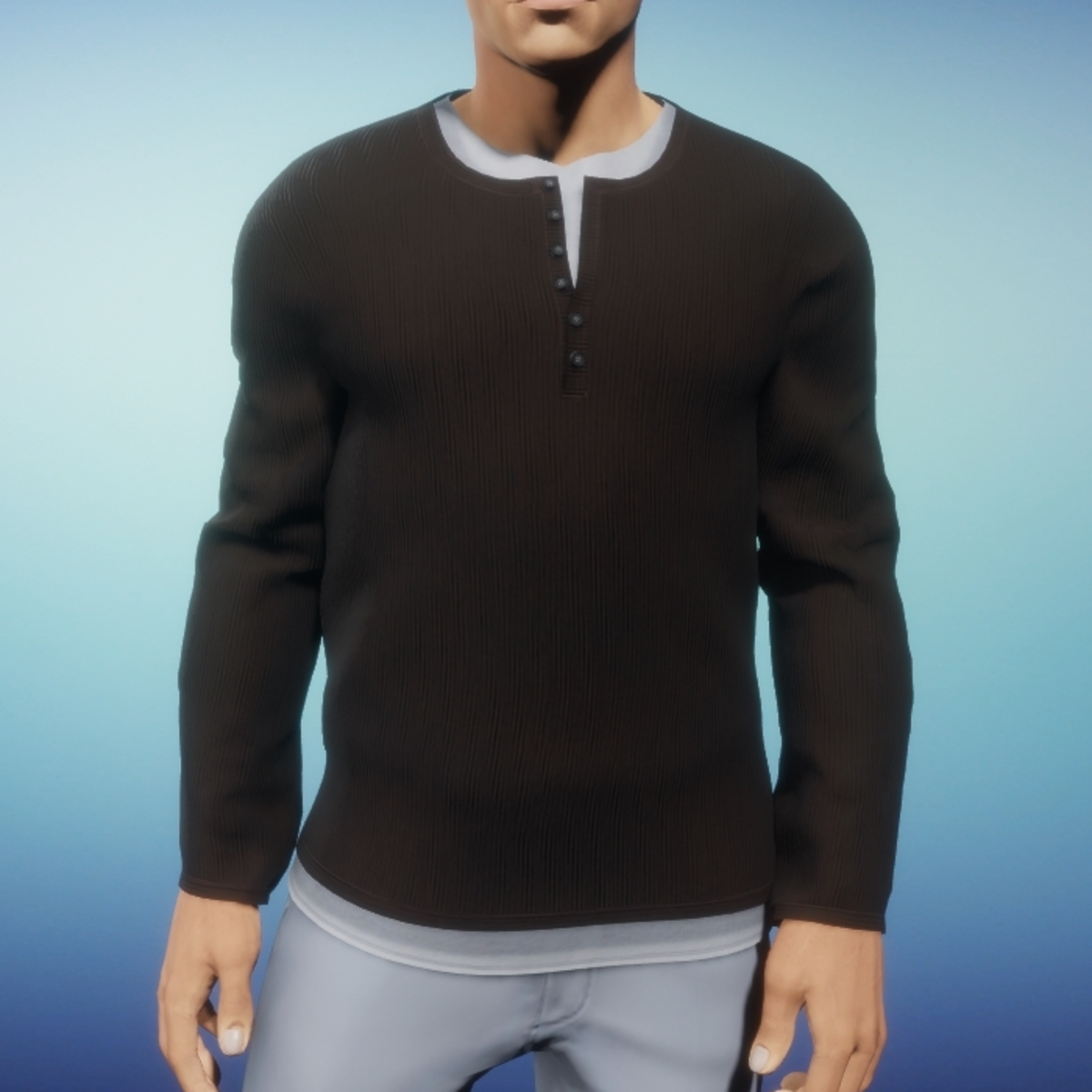 Men's Henley style shirt with white undershirt. Undershirt shows at neckline and hemline. Shirt has button placket closure that is partially buttoned. Please note that while in lookbook you will might see a little bit of skin poking out in the underarm area; however, once you have saved your look and Sansar has completed the process of baking your avatar the skin will not show in Sansar. Please be sure to hit the simulate button in the lookbook when wearing any clothing made in Marvelous Designer. This much improves the fit as well as gives you the chance to push the fabric around to your liking. It is advised to not wear hair until you have completed the simulate process.