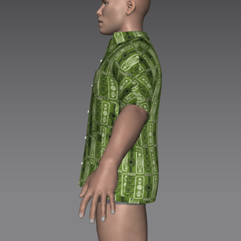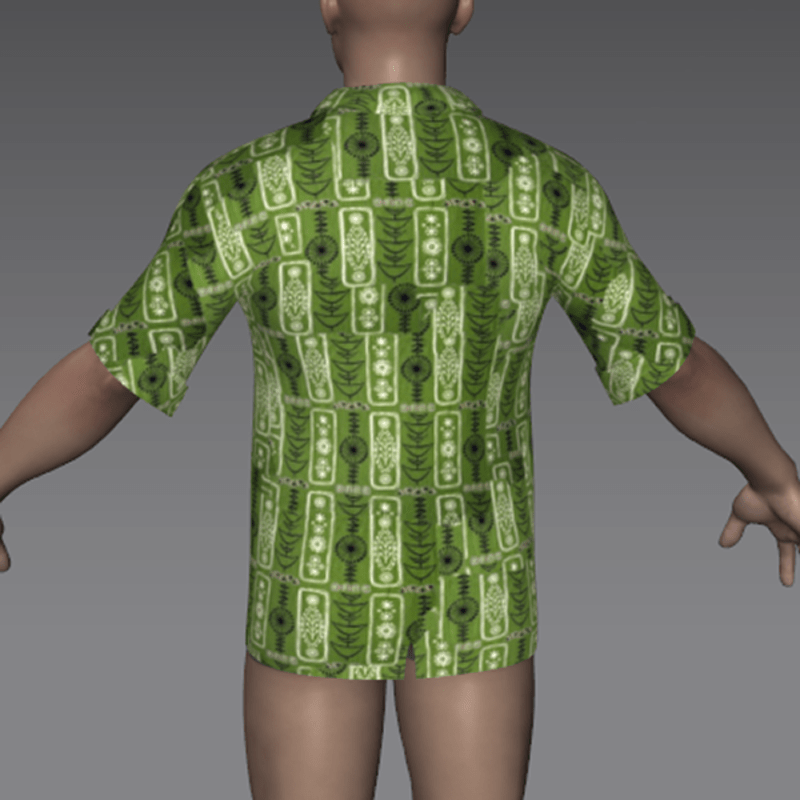 Men's shortsleeve shirt featuring a jaunty, retro/atomic 1950's barkcloth print in a summery dill-pickle green, black and cream. Cuffed sleeves, button-down collar, breast pocket, and flat hem for casual appeal. In a sturdy cotton. Stylin'!