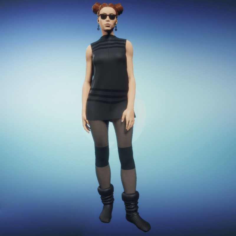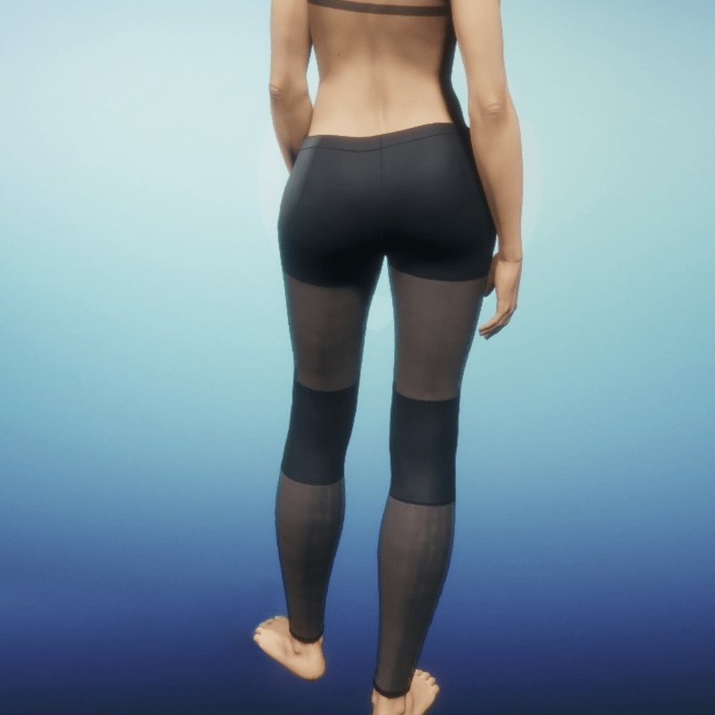 Leggings with sheer and opaque areas. Opaque areas have a moderate amount of luster. When layering in simulate cloth apply leggings after the outerwear has been worn. For instance if wearing all three pieces of the Cyber Punk outfit start with the cloak, then add the dress, then add the boots, and lastly add the leggings.