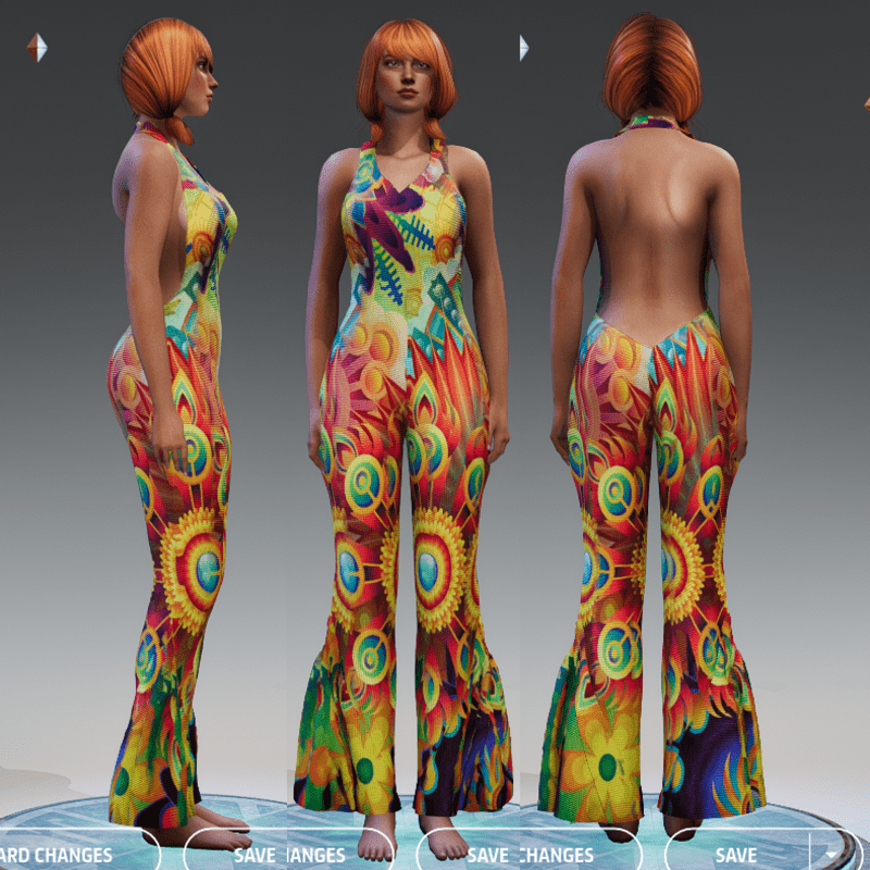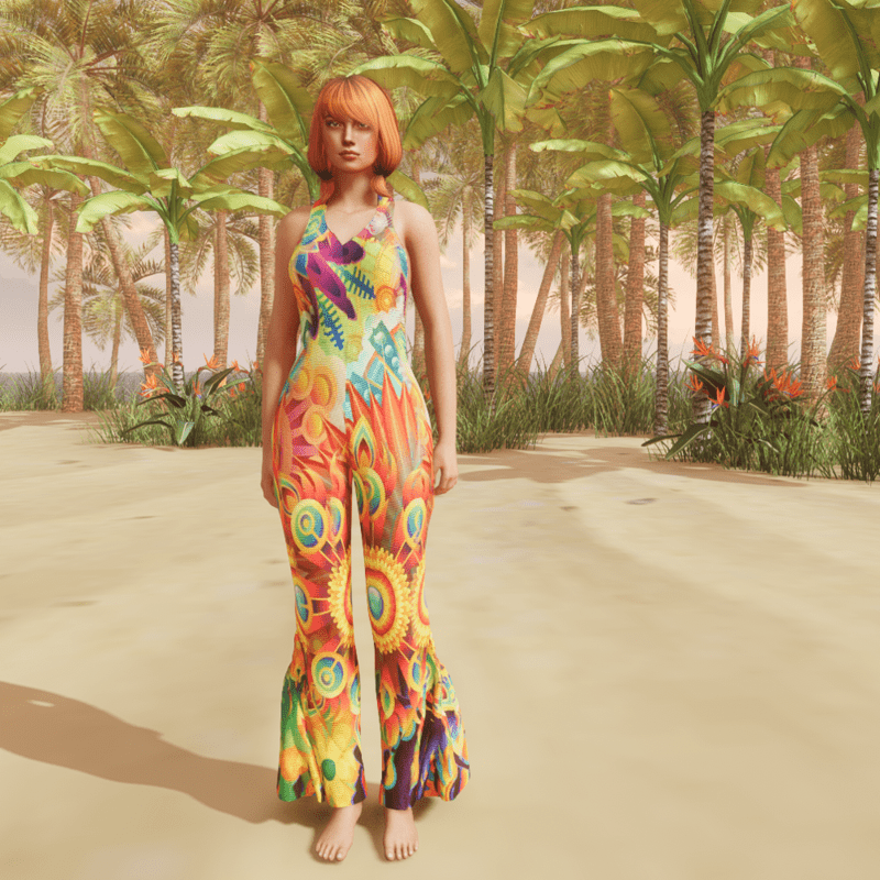 Seventies Jumpsuit, psychedelic theme, matted. The flares are created to the sides, so you can dance after simulating without sticking together.