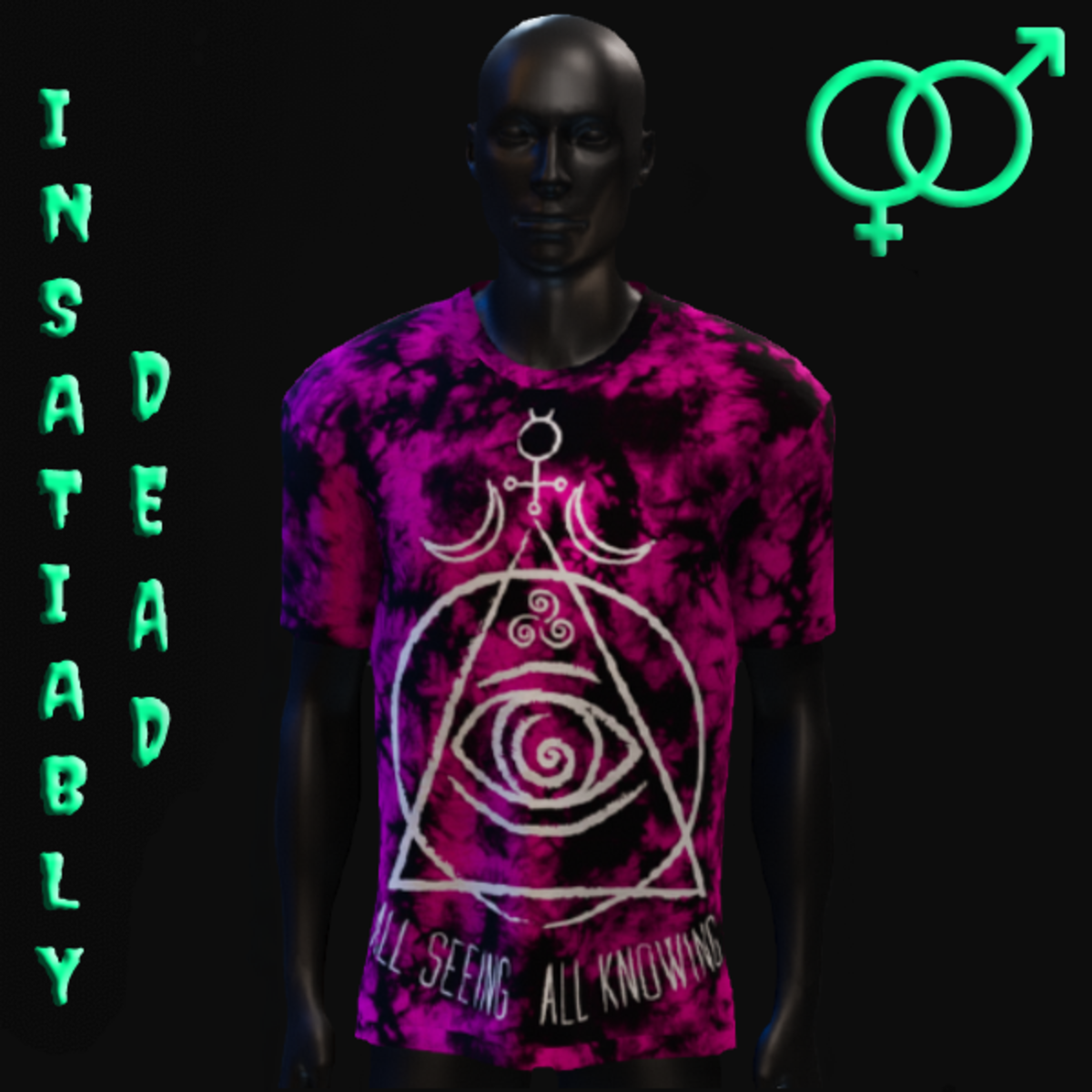 FOR ALL THE GHOULS AND GALS. UNISEX "ALL SEEING ALL KNOWING" T-SHIRT DARK TIE DYE [BLACK/PINK]. CREATED IN MARVELOUS DESIGNER WITH AVATAR 2.0. ADJUSTMENT MAY BE REQUIRED! FITTING INSTRUCTIONS CAN BE FOUND BY GOING TO THE LINK BELOW. https://help.sansar.com/hc/en-us/articles/115005693363-Fitting-Marvelous-Designer-clothing-to-your-avatar PLEASE RATE AFTER BUYING! IF ANY ISSUES OCCUR PLEASE CONTACT TEAGAN BROKKEN FOR ASSISTANCE. THANK YOU! <3 <3 GET INSATIABLY DEAD <3