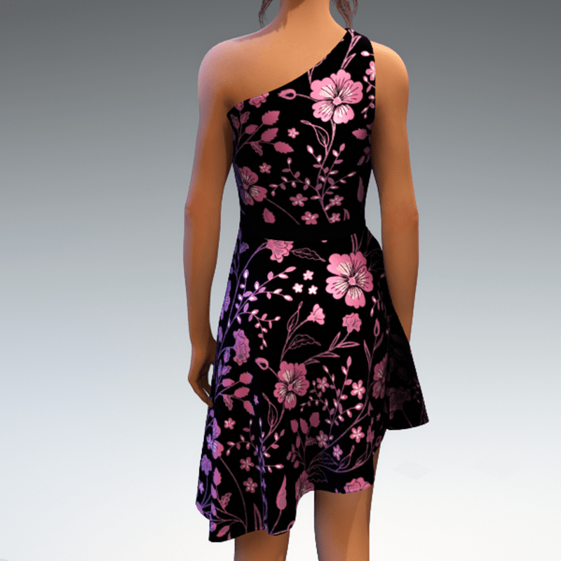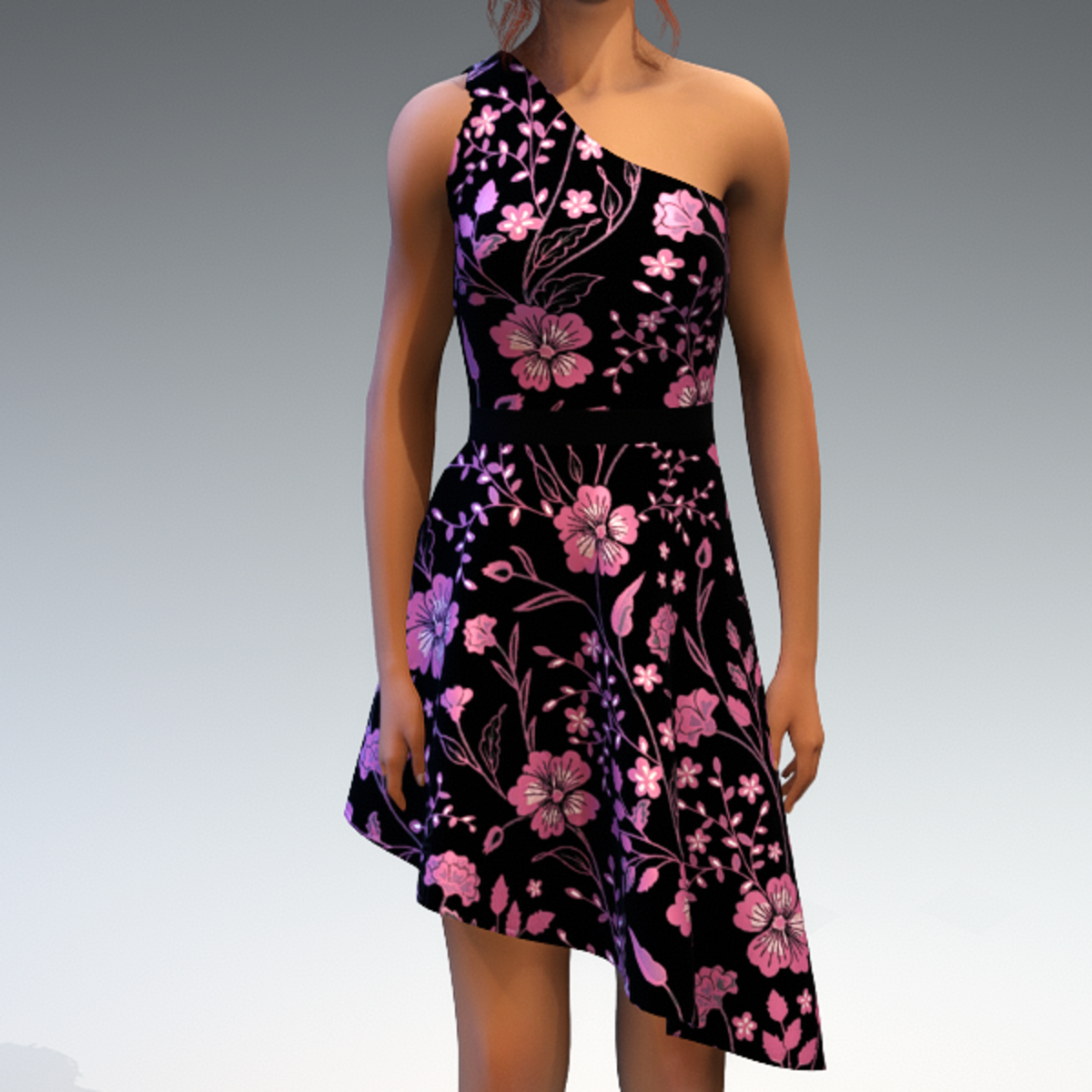 Asymmetric cocktail dress with a shiny floral print. By Sweet Distractions