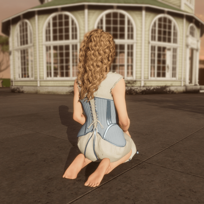 A pair of Victorian unmentionables (Chemise and drawers) covered by a baby blue corset lined with matching silk. The chemise and drawers feature an eyelet lace trim and blue silk drawstrings. This is a one piece outfit made with Marvelous Designer so you can adjust accordingly. Either chemise strap can be worn off-the-shoulder to expose extra décolletage. I suggest applying long hair to your avatar AFTER adjusting this outfit so it does not get caught. If you'd prefer the undergarments with out a corset, check out my undergarment set here: https://store.sansar.com/listings/02cc48ba-29ba-4c34-bc95-69b0d4e1fec9/simple-late-victorian-combination-undergarment