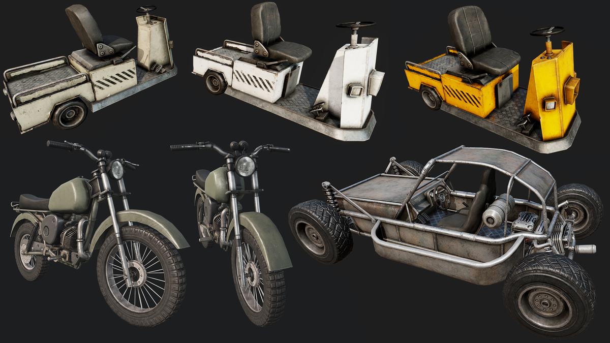 High Quality Old Motorcycle/Motorbike, Dune Buggy, and Industrial Car/Transportation Vehicle, with High-Quality PBR Texturing These Vehicles is listed as Vehicles, but they are not made Driveable, but i hope someone could figure out how to do that :). All Vehicles has Low Poly Physhape All Models where created with 3DsMax, Zbrush, Topogun, and Substance Painter.